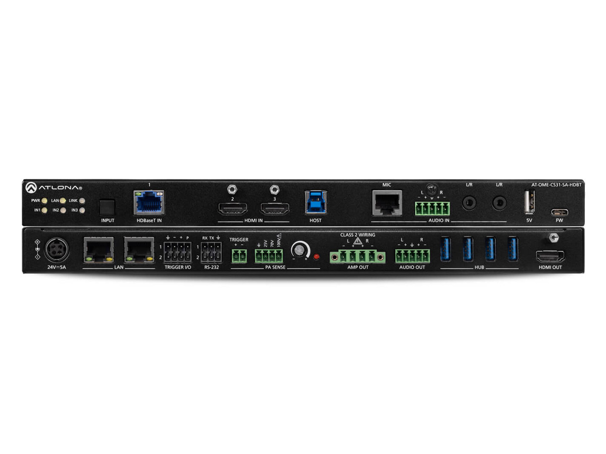 The AT-OME-CS31-SA-HDBT is an integrated AV presentation and collaboration switcher designed to combine source switching, audio mixing, amplification, and USB peripheral routing into a single low-profile enclosure. This system accepts one HDBaseT input and two HDMI inputs and outputs video to a single HDMI display. It is intended to simplify AV installations where remote source extension, local switching, and onboard audio are required.