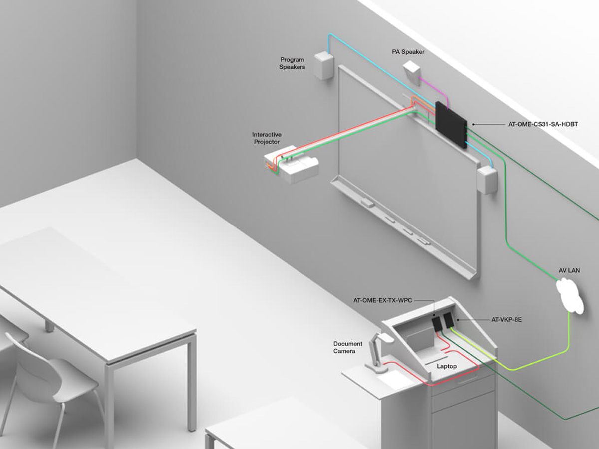 Practical applications include classrooms and meeting rooms where a combination of local and remote sources, USB peripherals, and amplified room audio are required. The ducking feature lowers program audio when a lectern microphone is active and PA mute allows school announcements or emergency messages to override system audio. Integration with control systems or Atlona keypads and Velocity touch panels is supported for user interfaces and automation.