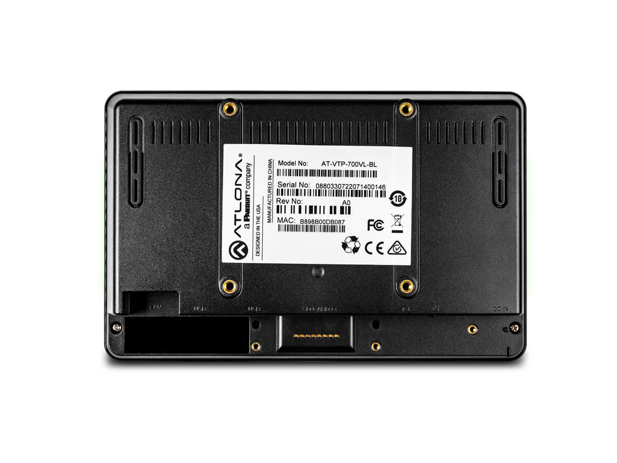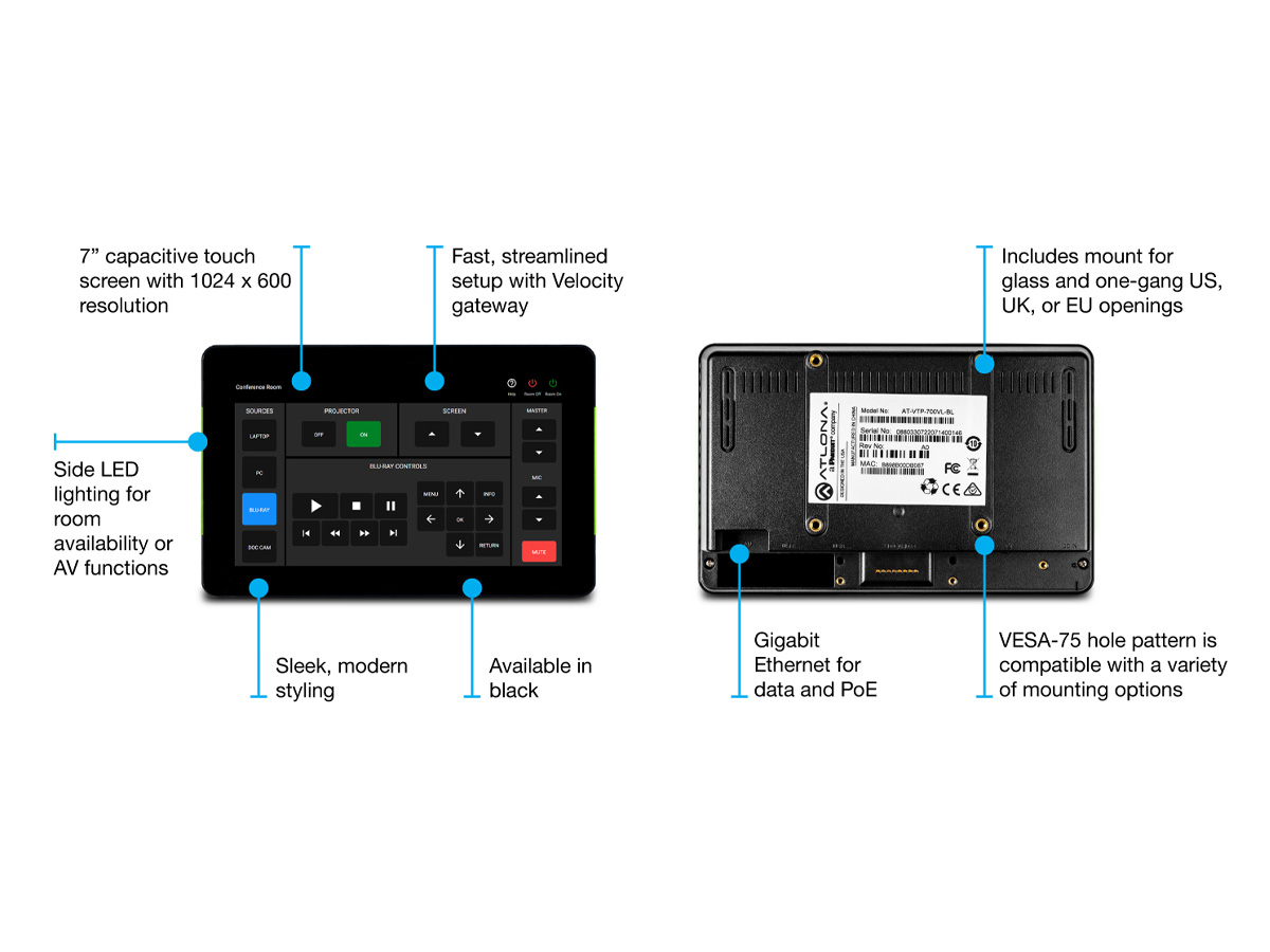 The AT-VTP-700VL is a 7 inch Velocity touch panel designed as a compact user interface for AV control and room scheduling. It provides a capacitive glass touch surface and a native 1024 x 600 resolution for clear graphics and responsive touch. The panel pairs with Velocity hardware or software server gateways to deliver preloaded GUIs and streamlined setup.