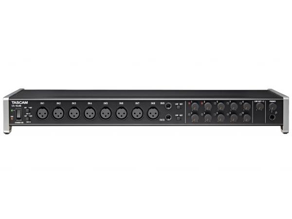 The TASCAM US-16×08 captures 16 mic and line inputs to your computer with clear sound quality and advanced features to manage big sessions. Eight Ultra-HDDA microphone preamps deliver the cleanest and quietest operation in their class while delivering up to 56dB of gain. An additional eight line inputs are provided, two of them switchable to instrument level for direct guitar or bass recording. Eight balanced line outputs are also available, two with a level control on the front panel for monitoring.