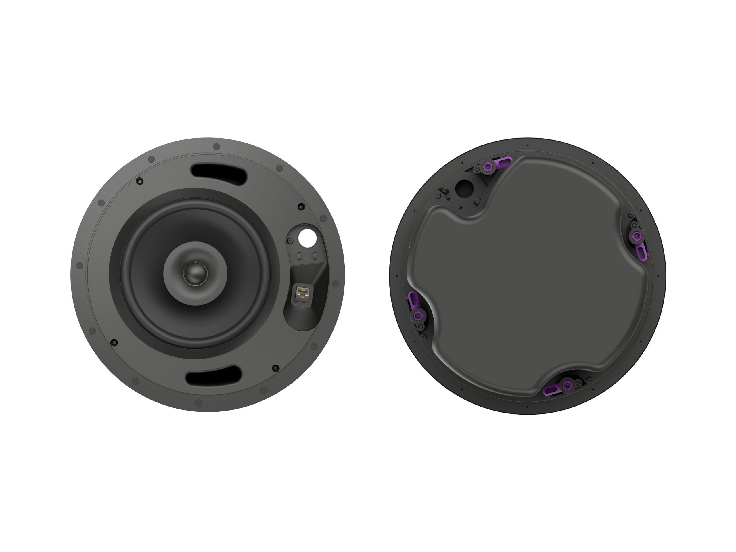 Connectivity centers on a Dante-enabled RJ-45 network port supporting audio over IP and remote management via Kramer Control or third-party control using the API. The unit exposes network management, DSP routing and power management settings through Kramer Speaker Utility. Physical installation is aided by magnetic paintable grills in black and white and a removable logo for discreet ceiling integration.