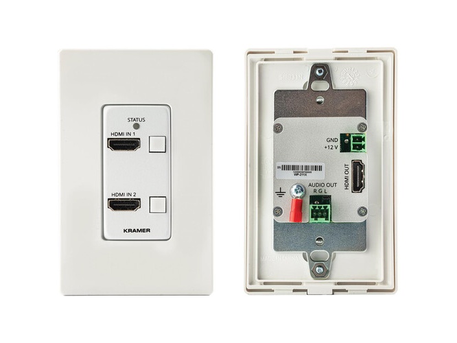 Typical applications include classrooms, conference rooms, huddle spaces and lecterns where two source devices must be switched to a single display while providing local audio output. The WP-211X is suitable for AV distribution installations that require compact in-wall switching and audio extraction. Its automatic switching logic can be configured to last-connected or priority-based behavior to match room workflows.