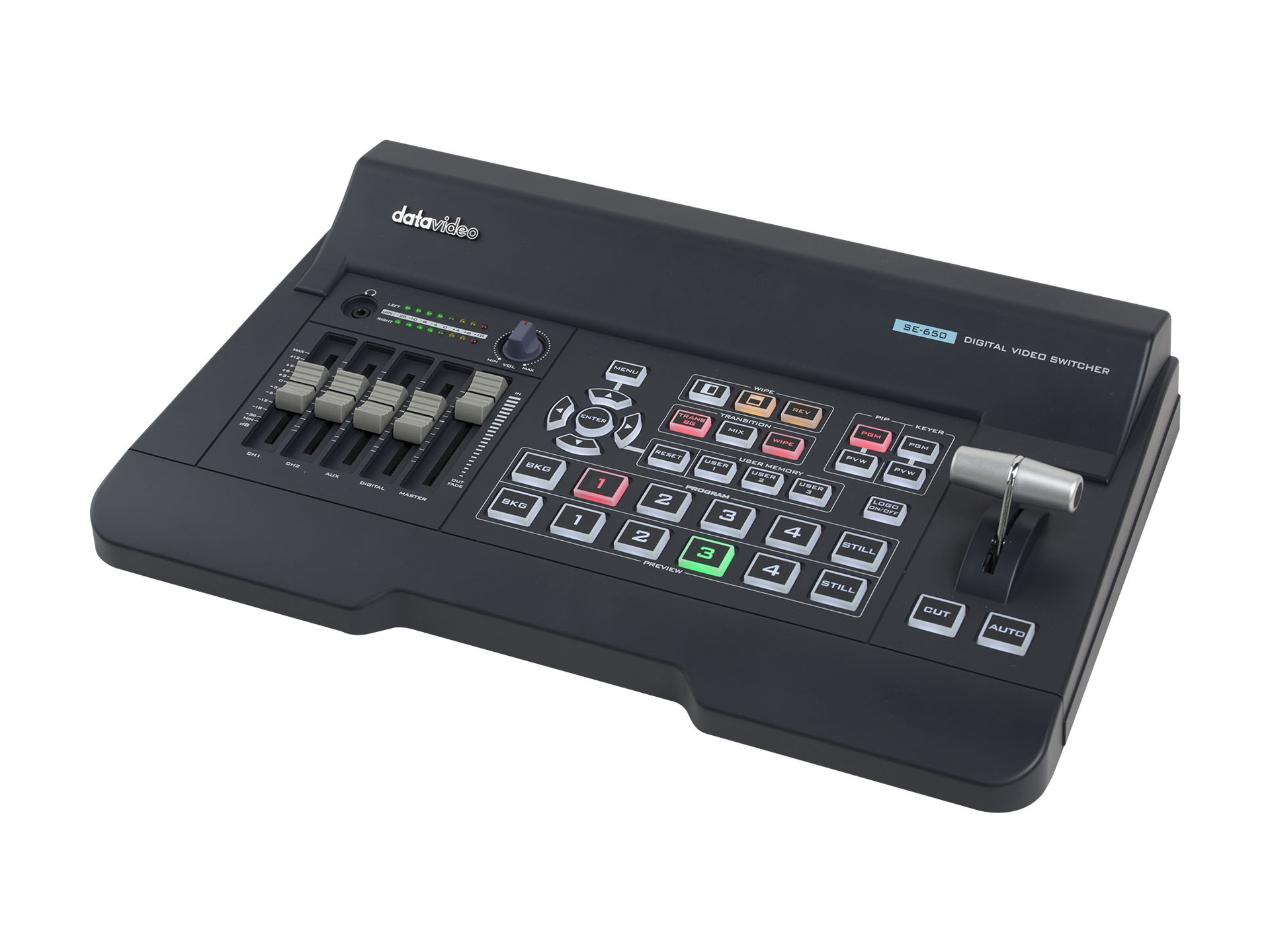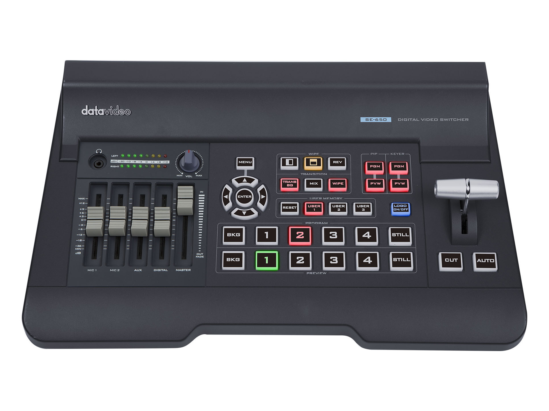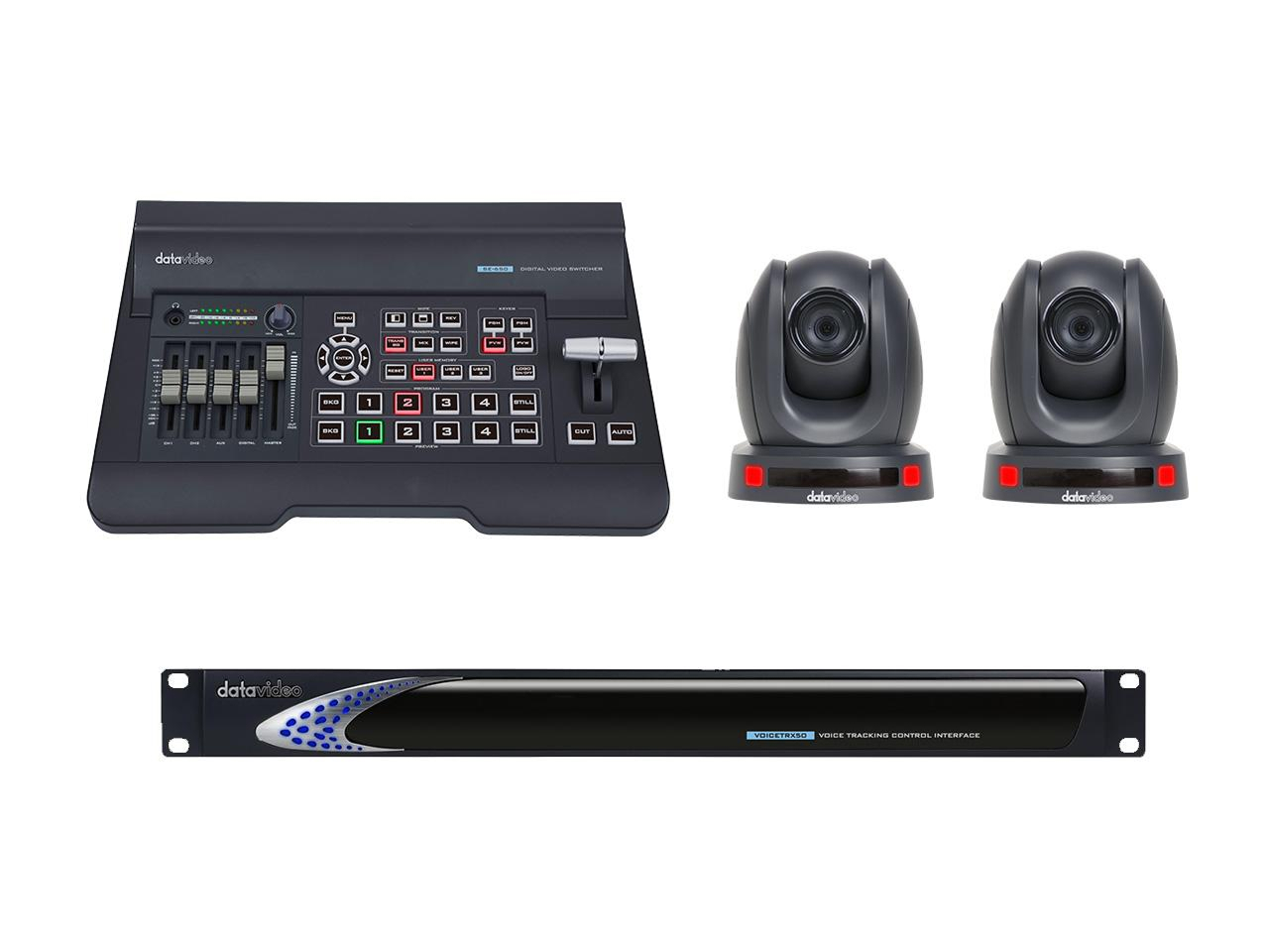 Voice-activated switching selects the active speaker and performs a Home First wide shot before cutting to the speaking camera to ensure natural transitions. The included PTZ cameras offer 20x optical zoom and AI-assisted one-click tracking for sharp close-ups without a dedicated operator. The SE-650 switcher provides mixed SDI and HDMI inputs and basic CG and keying features for titles and overlays.