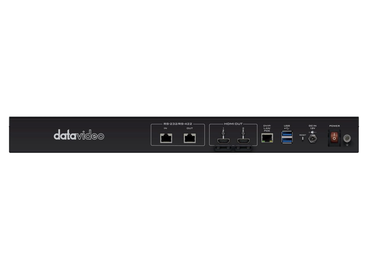 Connectivity includes SDI and HDMI camera connections, RJ-45 PoE for camera network power and streaming, USB audio interfaces, and HDMI program outputs for local displays. The system supports common USB mixers and audio interfaces so existing audio gear can be retained. When paired with compatible Datavideo switchers, on-screen CG name labels and subtitles can be generated in real time.