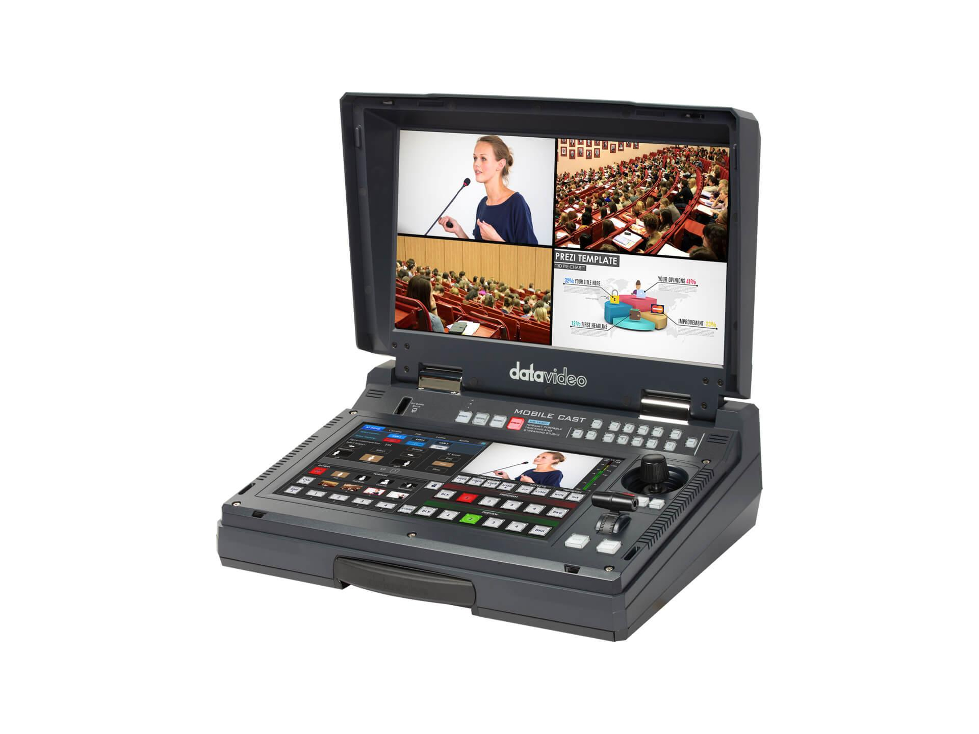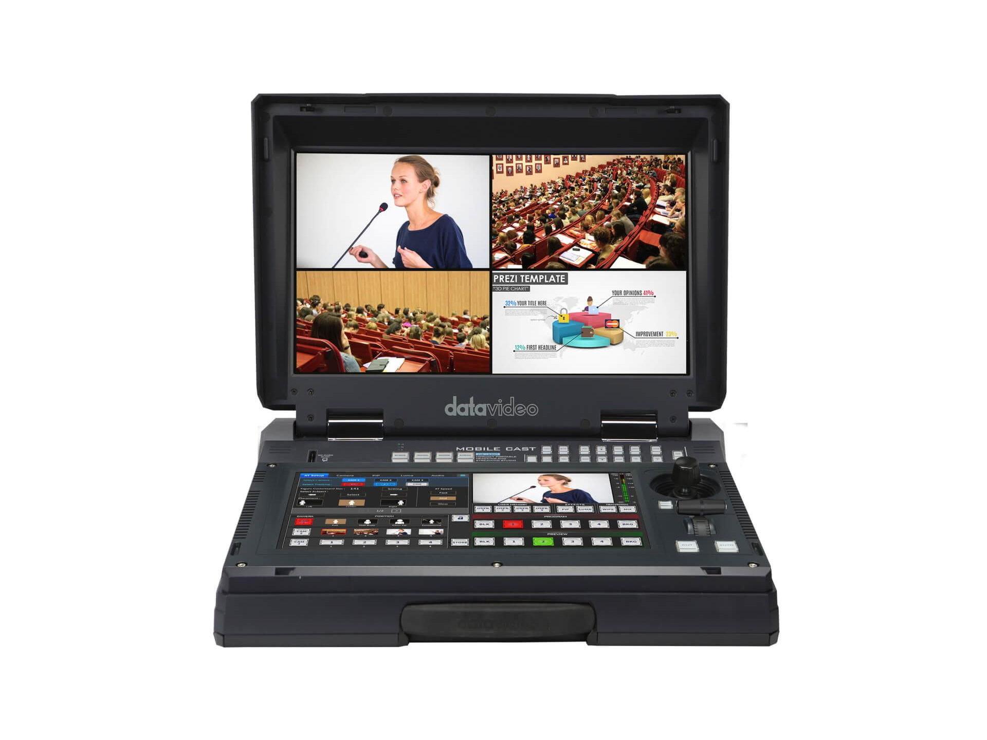 Key features include HDBaseT connectivity for long-distance signal and power delivery, a 14in touchscreen controller for real-time control, and support for H.264 streaming and MP4 recording. The platform supports Picture-in-Picture effects, a 4-channel audio mixer, and a 17.3in built-in monitor for program and multiview monitoring. AI auto tracking automates subject framing and switching to reduce operator load while maintaining professional production results.