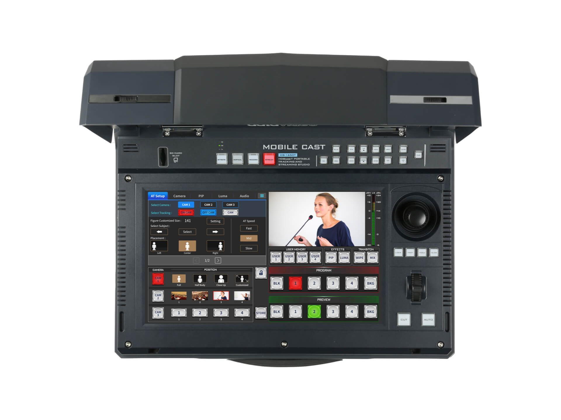 The integrated HS-1650T controller features a 14-inch touchscreen and built-in recorder, enabling real-time PTZ control and immediate file capture to SD cards. Key production features include program switching, picture-in-picture, a four-channel audio mixer, and a 17.3 inch multiview monitor for program and source monitoring. Firmware upgradeability allows the platform to receive feature enhancements without changing hardware.