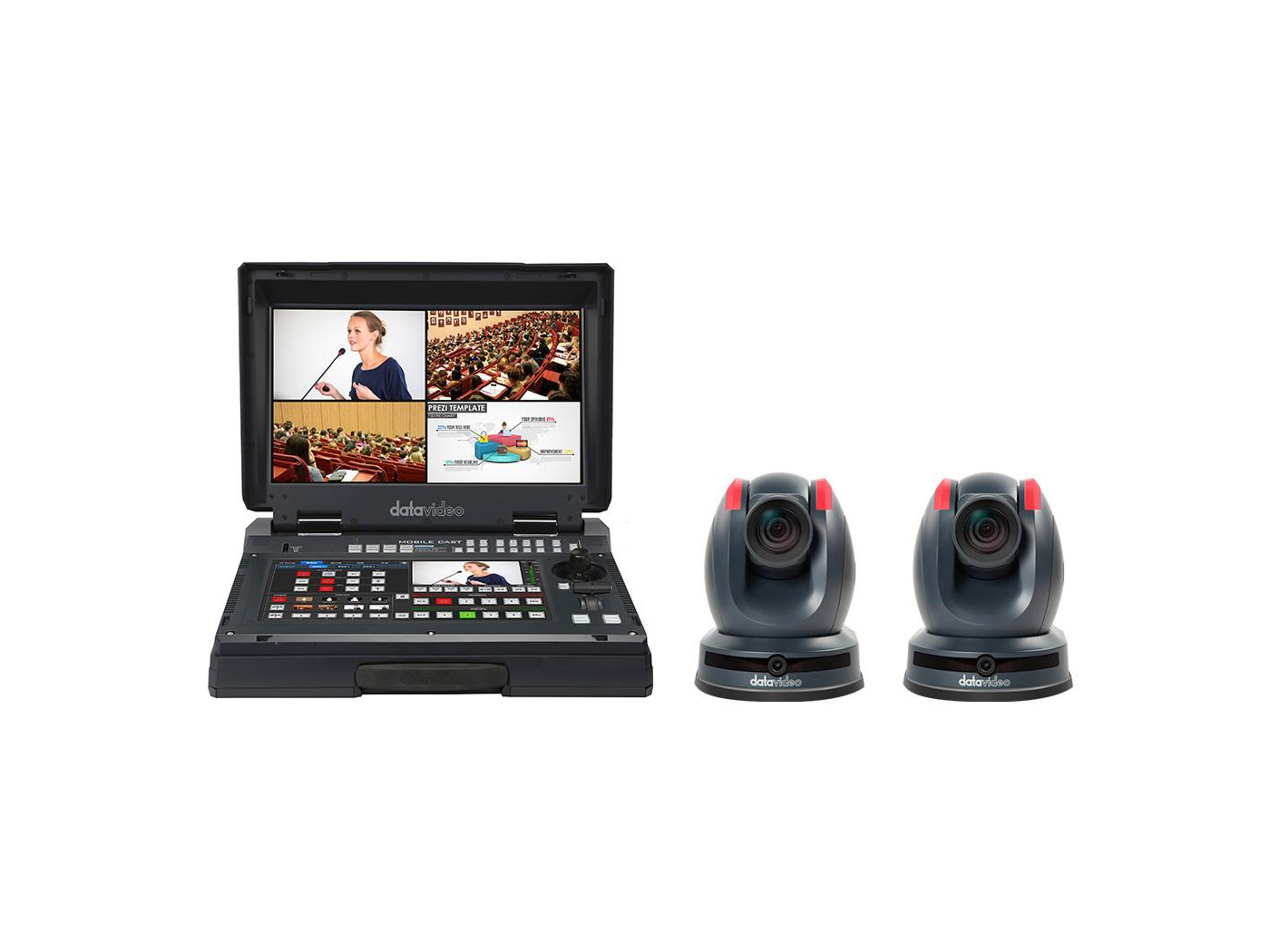 Key features include single-cable HDBaseT transmission for video, power, control and tally up to 100 meters, an intuitive touchscreen for camera and switcher control, and AI-driven auto tracking for smooth subject follow. The cameras provide 30x optical zoom and a dual-lens arrangement to maintain subject tracking while offering a wide panorama view. The recorder outputs MP4 files directly to removable media for immediate upload or archive.