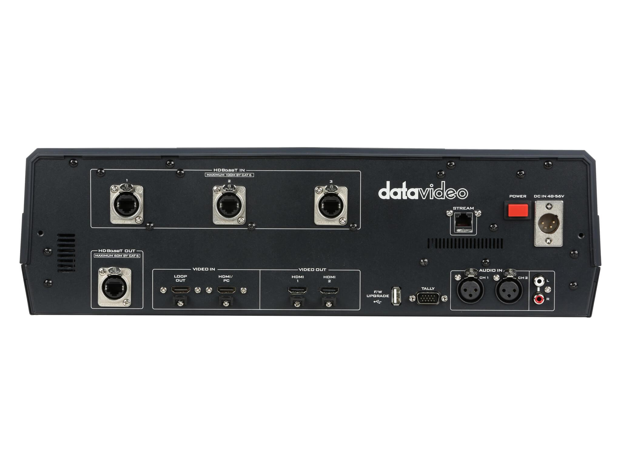 Connectivity is centered on HDBaseT for video, power, control, and tally over a single Cat cable up to 100 meters, plus HDMI loop-out for external monitoring. Control options include the 14in touchscreen, a joystick for PTZ operation, web browser UI and socket commands for streaming control, and compatibility with Datavideo RMC controllers for quick framing selection. The HS-1650T also supports SRT and dvCloud integration to improve stream reliability over challenging networks.