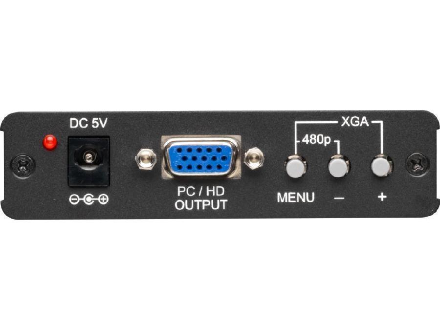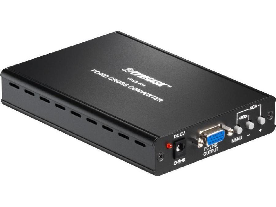 1T-VS-434 PC/HD Cross Converter is a Cross Format Scaler for PC and HD formats and resolutions. The input resolution is automatically detected and can either be RGBHV or YPbPr format. Output Resolutions up to 1920×1200 and 1080p are accommodated. In addition to converting between PC and HD, the unit can take a 480i Component Video signal (from a DVD Player for example) and convert it to PC or HD resolutions. The output resolution and refresh rate is selected via push buttons on an On Screen Display. The integral processor provides control over many signal parameters, such as: Contrast, Brightness, Color Saturation, Sharpness, R-G-B Levels and Aspect Ratio.