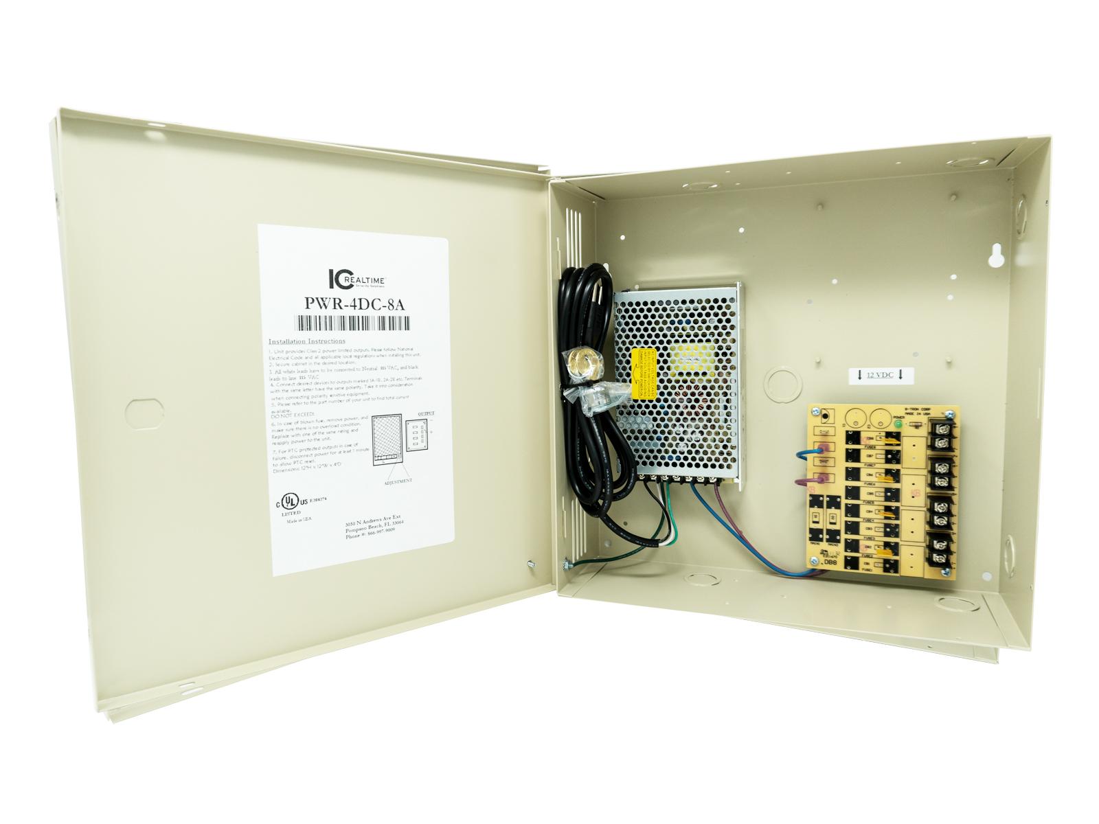 High quality UL listed PWR-4DC-8A provides 12VDC at 8 Amp of total continuous power supply to 4 outputs. Perfect for CCTV applications.