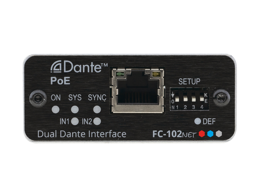 FC−102Net is a compact 2−channel Dante™ encoder with 2 balanced mono audio inputs that enables connecting non−Dante sources, such as microphones, laptops and players to a Dante network. It supports line level and microphone level sources and can provide 48V phantom power per input. FC−102Net is powered over Ethernet from any standard PoE providing network switch.