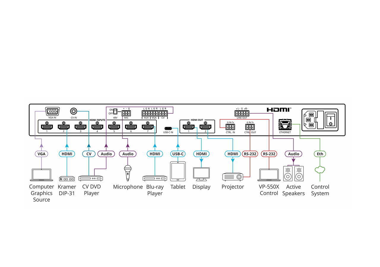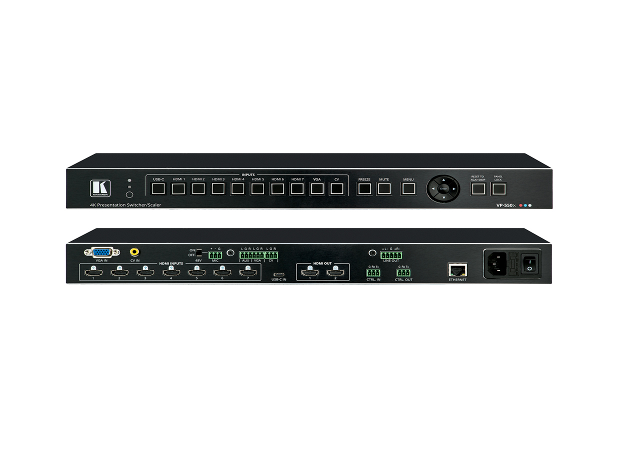 The Kramer VP-550X is a professional presentation switcher and scaler designed to accept and scale multiple HDMI, USB-C, VGA and composite video sources. It provides mirrored HDMI outputs and balanced stereo audio output to simplify signal distribution in meeting rooms, auditoriums and AV systems. The unit supports high-resolution sources up to 4K@60 (4:4:4) and complies with HDCP 2.2.