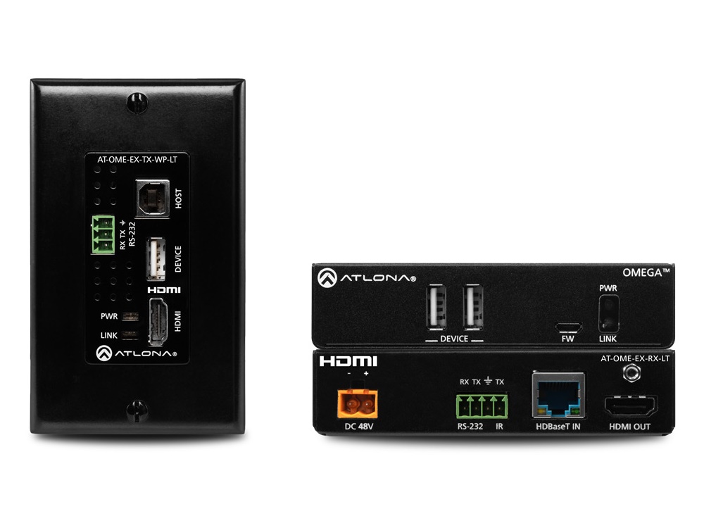 The Atlona AT-OME-EX-WP-KIT-LT is an HDBaseT extender for video up to 4K/60 4:2:0, plus embedded audio, control, and USB over distances up to 130 feet (40 meters) for 4K/UHD, and up to 230 feet (70 meters) for 1080p/60 video. The transmitter features a US one-gang, wallplate form factor, and includes interchangeable black and white wallplates and faceplates. Part of the Omega™ Series of integration products for modern AV communications and collaboration, the OME-EX-WP-KIT-LT is HDCP 2.2 compliant and extends RS-232 control signals. The integrated USB extension addresses the challenge of connecting between USB devices at remote locations, and is ideal for software video conferencing and touch or interactive displays. The transmitter includes a USB 2.0 host interface for a PC, plus a peripheral device such as a speakerphone, microphone, or keyboard and mouse. The receiver provides two USB interfaces for devices such as a camera, soundbar, or display.