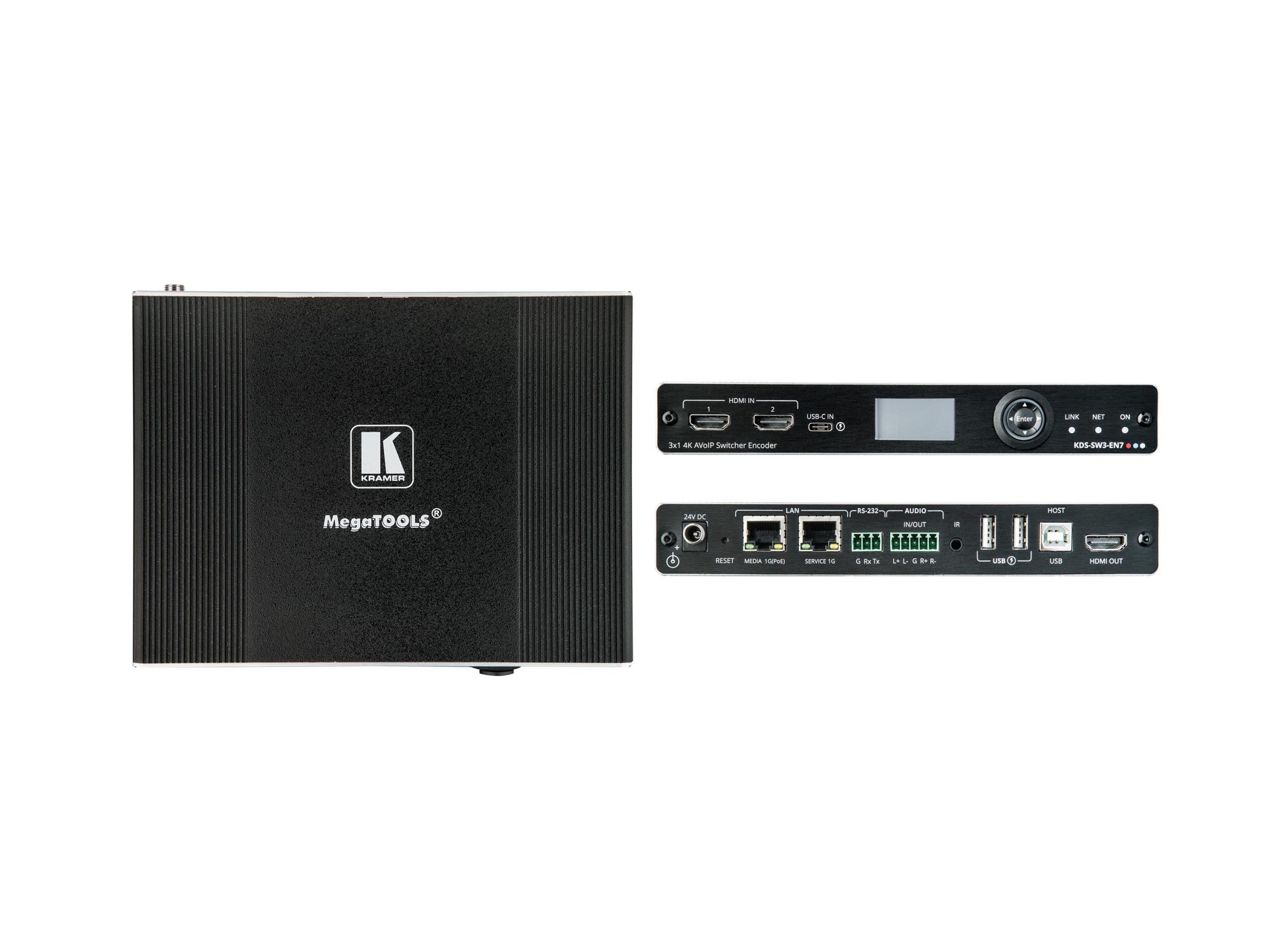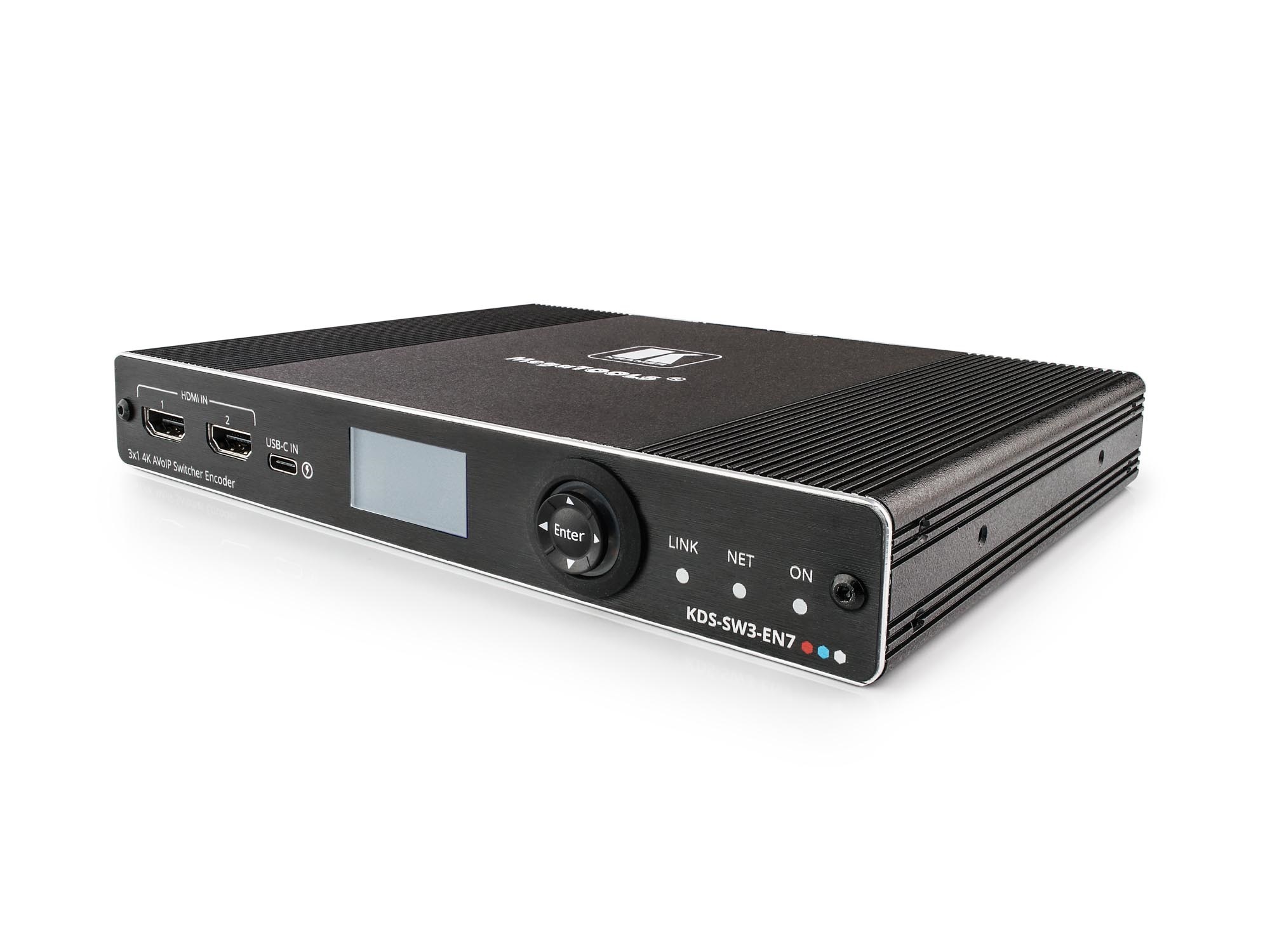 KDS-SW3-EN7 auto-switch encoder with two HDMI and USB-C inputs with Dante embedding and de-embedding.