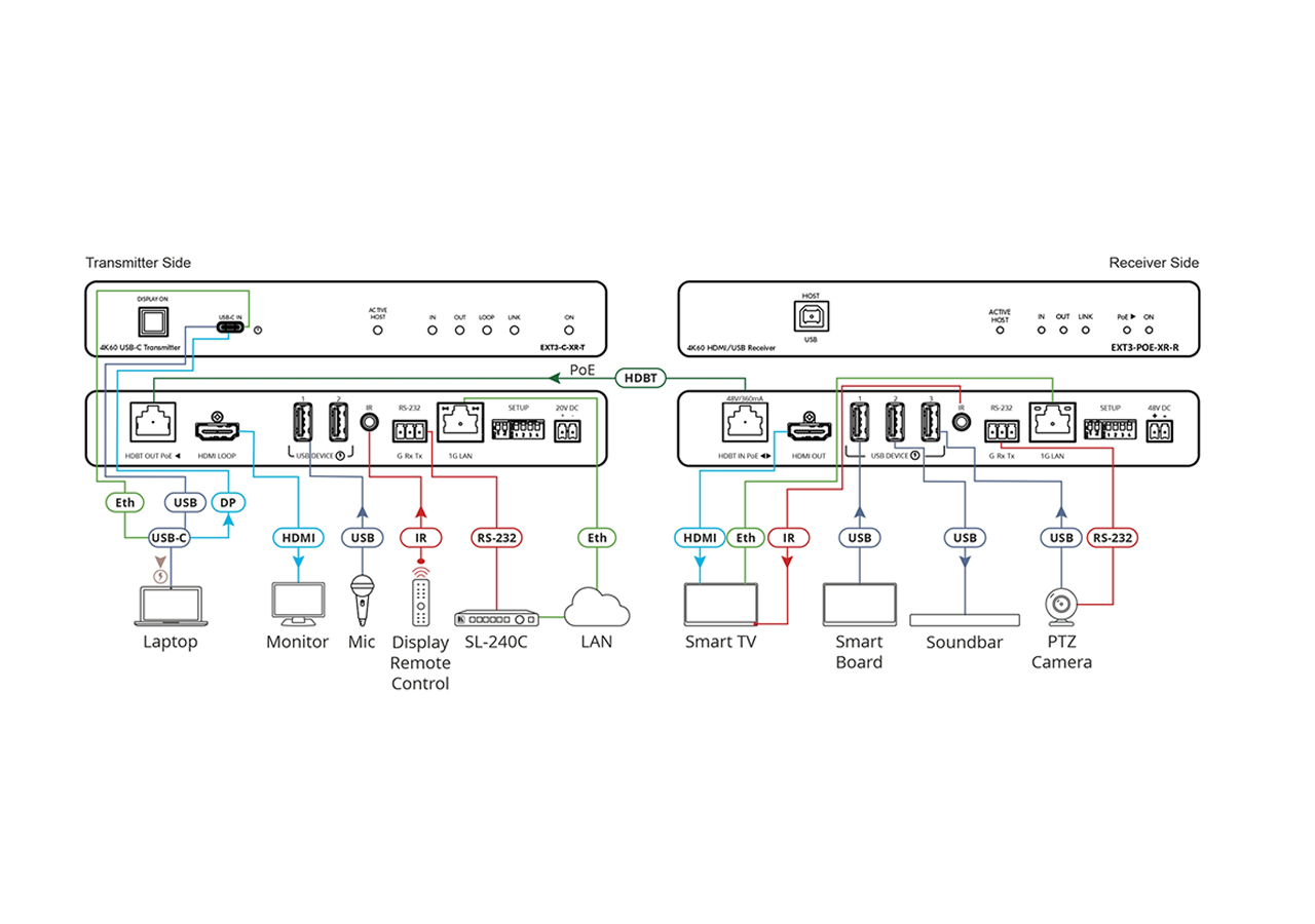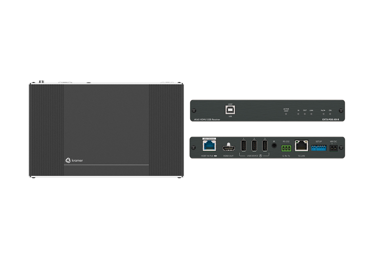 The EXT3-POE-XR-R is an HDBaseT 3.0 receiver designed to restore extended HDMI video, USB, Ethernet, RS-232 and IR signals at the display end. It receives an HDBaseT 3.0 stream and converts it back to native HDMI, USB and control interfaces. The receiver supports bidirectional power over the extension cable for flexible powering topologies.