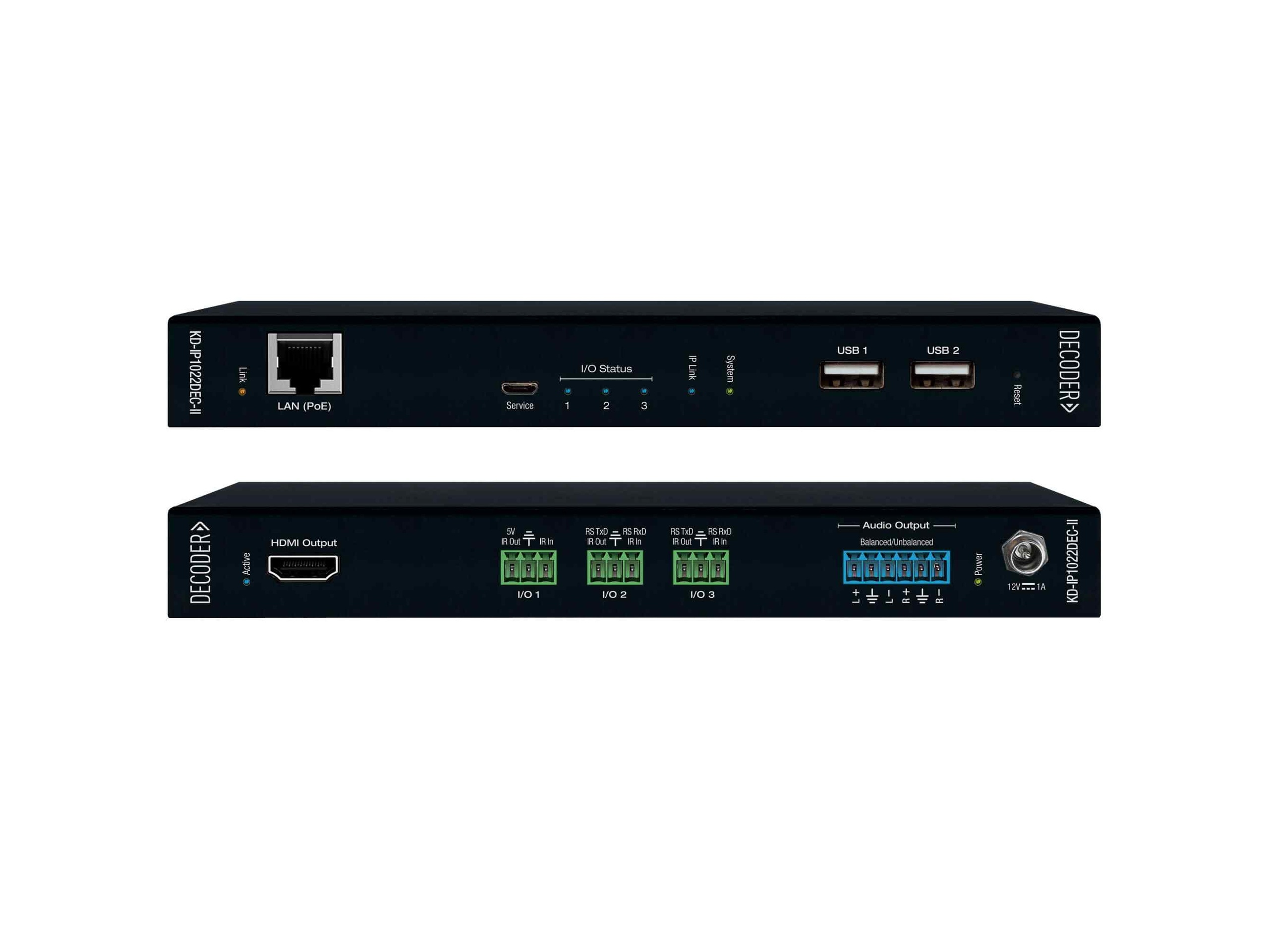 The KD-IP1022DEC-II is a 4K AV-over-IP decoder designed to receive networked video streams and deliver HDMI output with KVM and USB routing plus audio de-embedding. It supports DCI 4K30 sources and offers PoE for flexible deployment – making it suitable for AV distribution systems that require low-latency video and centralized management. The decoder integrates with Key Digital encoder products to create scalable video wall and distribution systems.