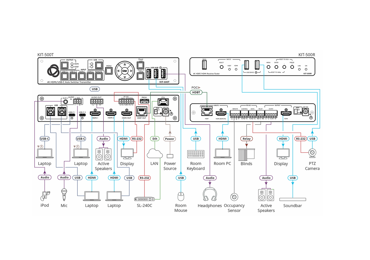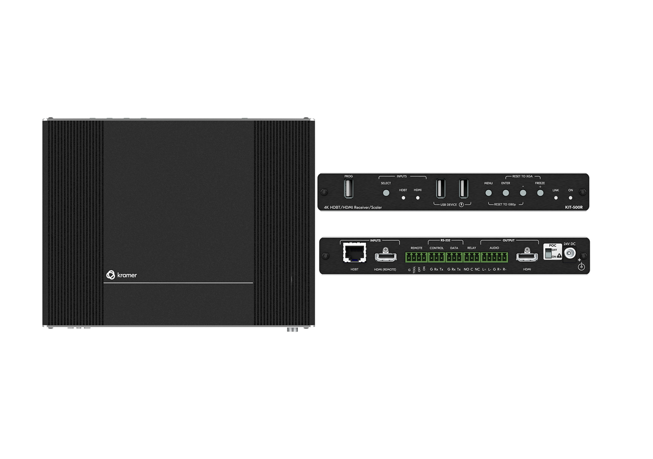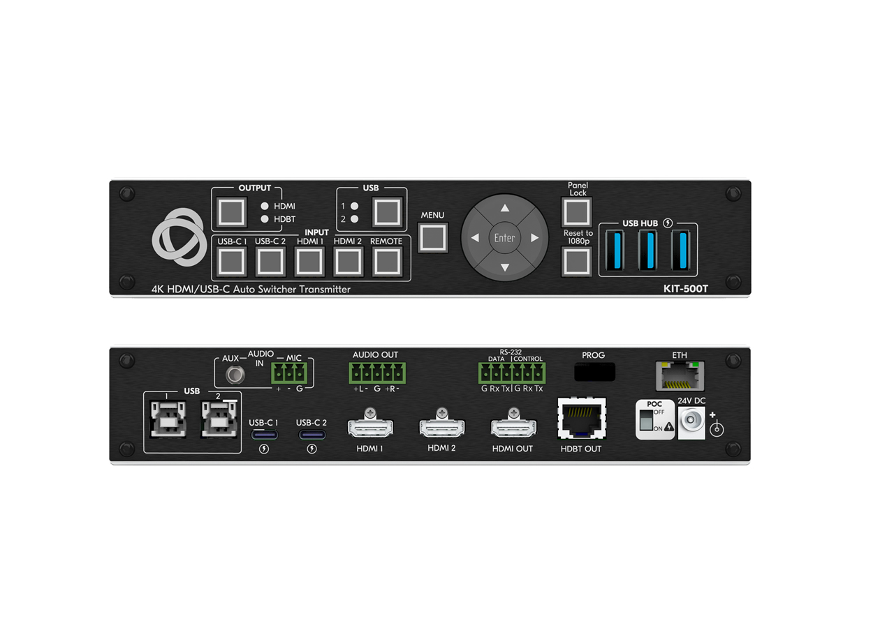 The KIT-500 is an integrated transmitter and receiver matrix kit designed to route multiple AV sources to local and remote displays while extending USB and control signals over a single HDBaseT link. It combines a 5×2 switcher matrix workflow with scaling and ProcAmp image processing to deliver consistent presentation quality. The system supports both USB-C and HDMI sources and extends them to HDMI and HDBaseT outputs.