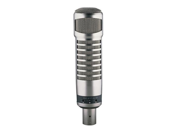 The Electro-Voice RE27N/D is a professional-quality dynamic cardioid microphone designed for broadcast production announce and voice-over, high-quality recording and sound reinforcement applications. The RE27N/D utilizes a revolutionary neodymium-alloy magnet and a reinforced diaphragm dome, a combination offering increased sensitivity (up to 6-dB more output), undistorted output at high sound pressure levels and an extended high-frequency response. The exceptional sensitivity of the RE27N/D, excellent transient response and inherently low noise of the dynamic transducer, all combine to ensure a superior signal-to-noise ratio, easily comparable to the finest condenser cardioid microphones. to further reduce noise, a highly effective hum-bucking coil is used to attenuate hum from lighting and other sources. The RE27N/D’s continuously Variable-D‚ design reduces bassboosting “proximity effect” to maintain a uniform low-frequency response, up-close or at a distance. Two easily operated bass roll-off switches, offering a sharp low-frequency cut at 200 Hz or a gentle roll-off, are available for special situations where bass attenuation is required. A third switch is available for reducing the high-frequency treble boost. The true, uniform cardioid polar pattern of the RE27N/D offers the greatest rejection at 180° off axis, insuring superior gain-beforefeedback. An integral blast and wind filter covers each acoustic opening on the RE27N/D, allowing “close-talk” situations with no worry of “P-pop,” breath sounds or excessive sibilance. Part of the filter also shock mounts the internal microphone transducer, reducing the transfer of vibration from external sources. This shock-mount system along with the extremely rugged exterior steel casing allows the RE27N/D to withstand all the rigors of professional use.