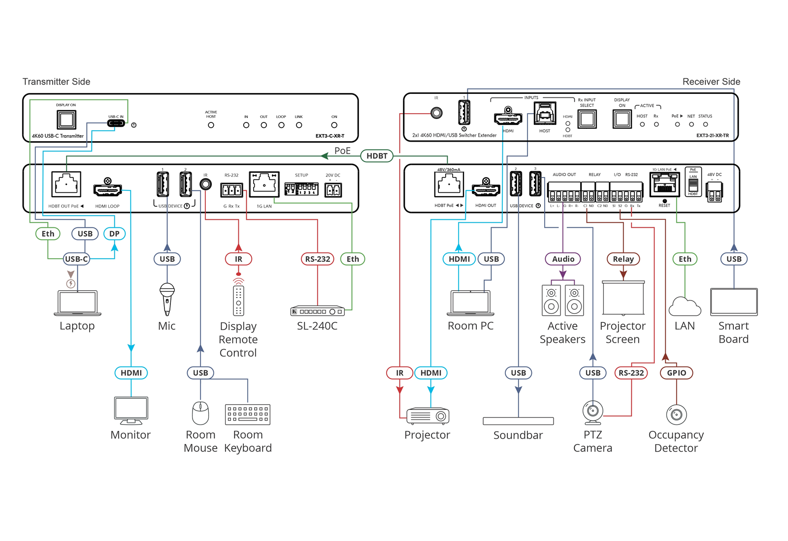 This extender is suited to conference rooms, lecture halls and shared spaces that require integrated AV and USB device sharing between local and remote participants. It enables hybrid meeting workflows by switching AV and USB hosts to route content to both in-room displays and online participants. The device also supports digital signage and AV distribution scenarios that require long-reach HDMI and control extension.
