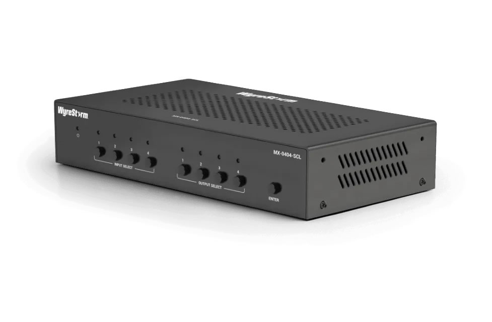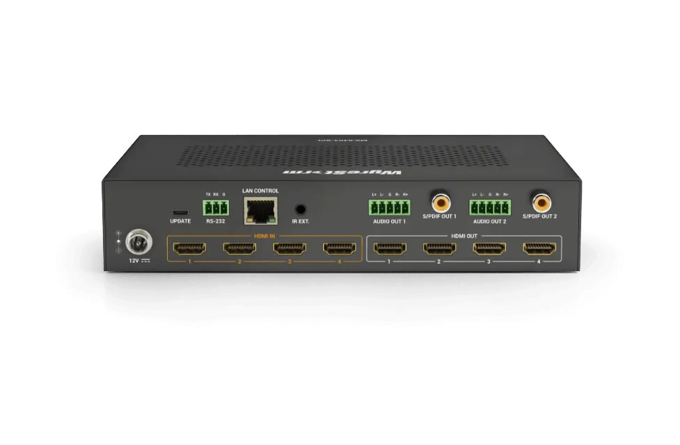 Typical applications include corporate AV distribution, education campuses, hospitality installations and digital signage installations where mixed-resolution displays and audio extraction are required. The MX-0404-SCL supports video wall and multi-view layouts and provides API-accessible features for automation and scheduling. It also supports AV mute and API-triggered standby to reduce power consumption during off hours.