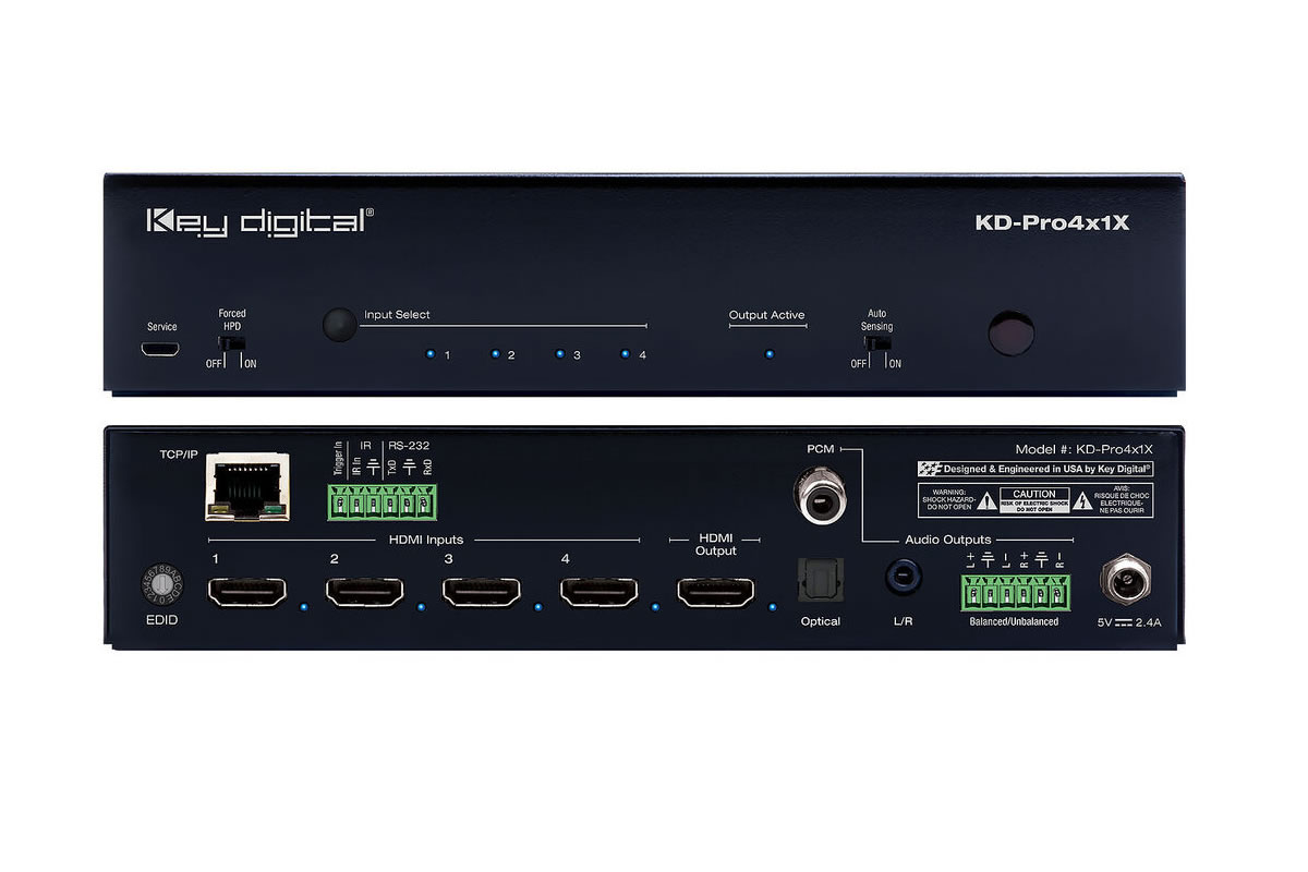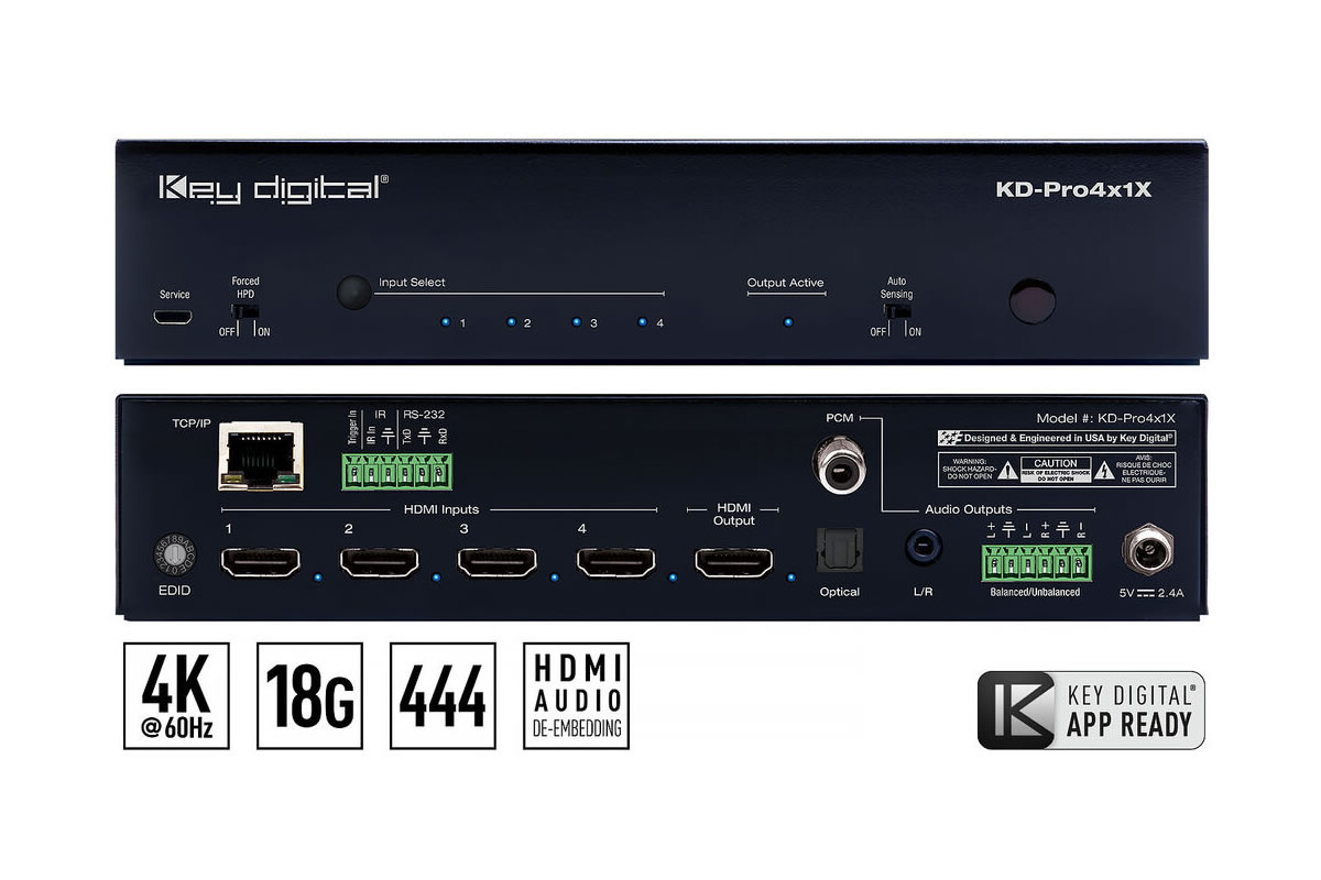 Connectivity covers four HDMI inputs and one HDMI output, plus analog 3.5 mm stereo, balanced/unbalanced block line level, and optical S/PDIF outputs for de-embedded audio. Control options include front panel buttons, IR, optical IR, RS-232, trigger in, TCP/IP, and app-ready integration via Key Digital’s control ecosystem. The switcher also supports CEC passthrough and PTZ camera integration when combined with compatible Key Digital accessories.