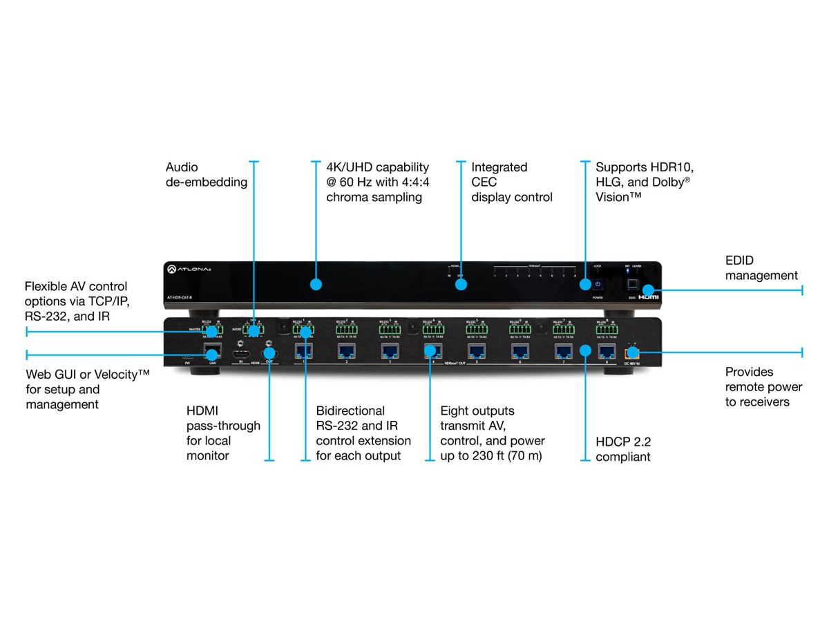 The Atlona AT-HDR-CAT-8 is an 8-output HDBaseT distribution amplifier that delivers 4K/60 video and HDR formats to multiple displays. It takes a single HDMI source and replicates the signal across eight HDBaseT outputs plus a local HDMI pass-through. The unit is built for commercial AV environments where long-distance extension and reliable signal distribution are required.