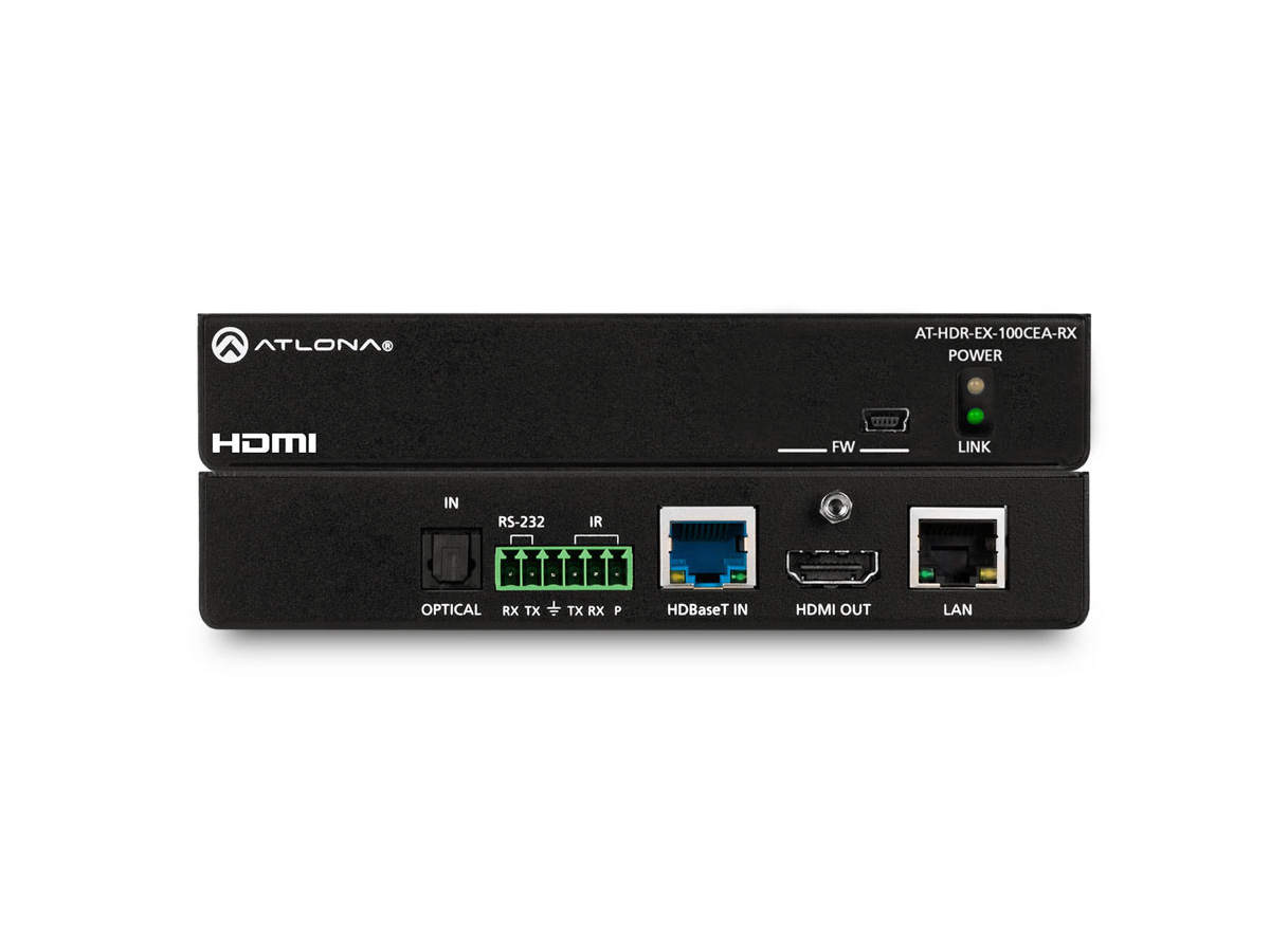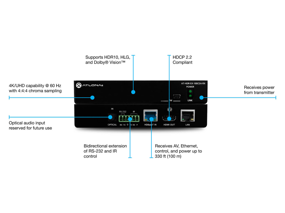 The AT-HDR-EX-100CEA-RX is a compact HDBaseT receiver designed to extend 4K HDR signals to remote displays. It receives HDMI video, audio, Ethernet and control over Category cable up to 330ft (100m). The receiver supports HDR formats and preserves full chroma and color depth for accurate image reproduction.