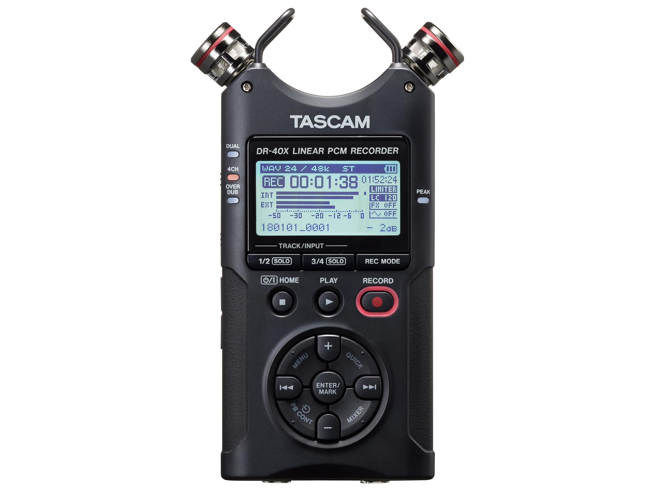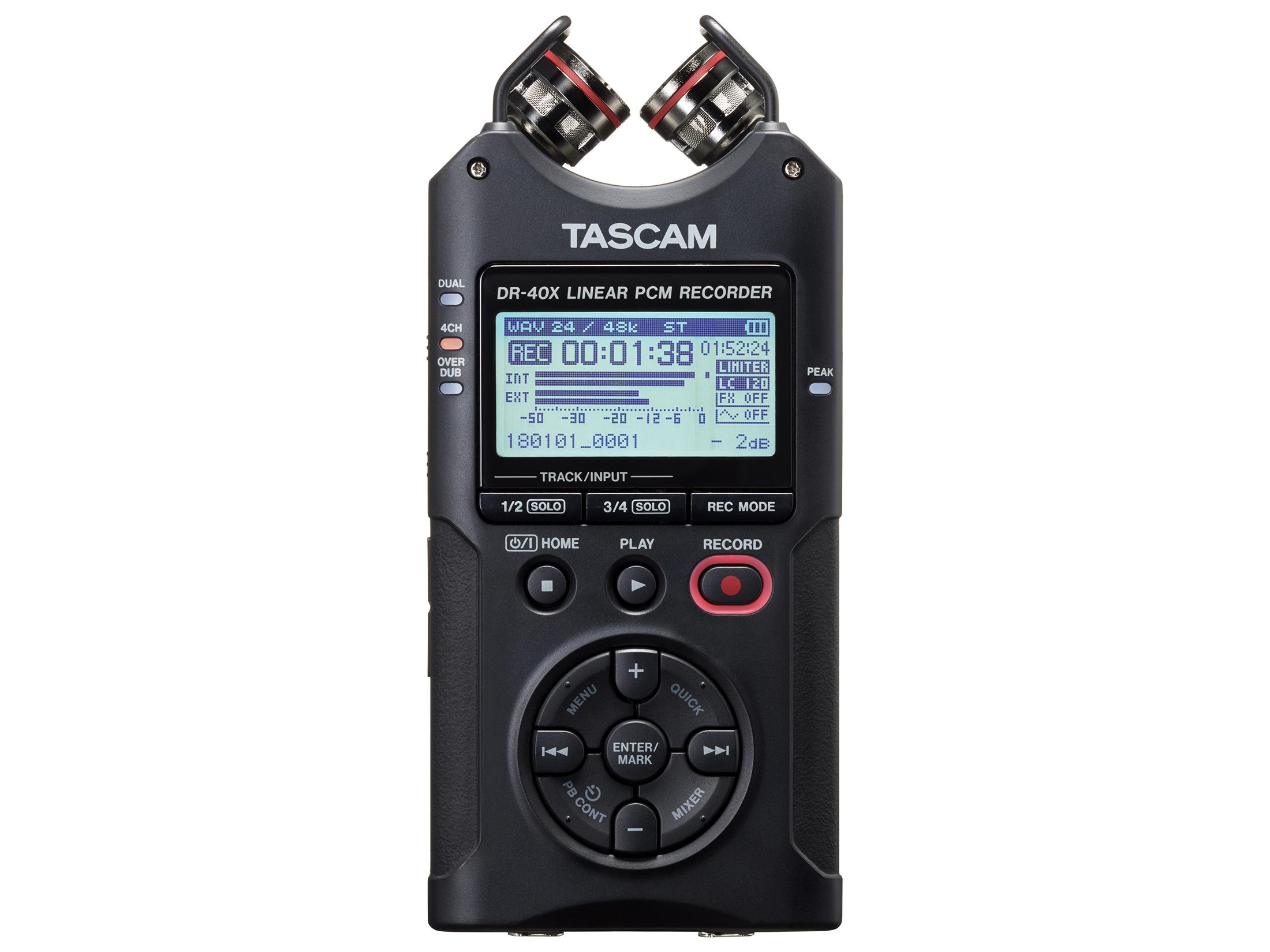 dr-40x uses only two AA batteries and has ultra-long battery capability. When using built-in microphones, recording lasts 17.5 hours when recording with standard 2ch WAV, 44.1kHz/ 16bit format using alkaline batteries.