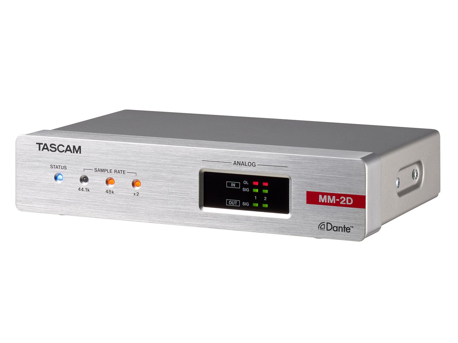 The MM-2D-X is a compact converter that converts 2-channel mic/line input/output signals into Dante signals. With half the size of a standard 1U rack, the MM-2D-X is suitable for different Dante systems as an exquisite analog output unit. The built-in DSP mixer enables small scale systems to fully perform with a variety of input/output models the TASCAM Dante Compact Processor Series offers. MM-2D-X supports up to 96kHz/24bit and uses XLR connectors for analog mic/line input/output.