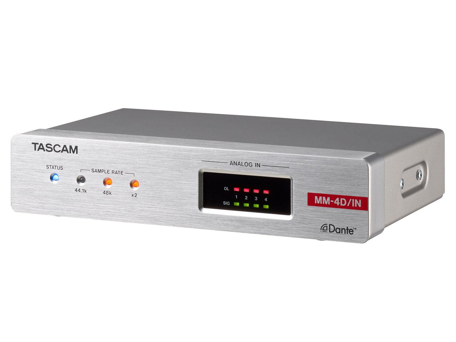 The MM-4D/IN-X is a compact converter that converts 4-channel mic/line input signals into Dante signals. With half the size of a standard 1U rack, the MM-4D/IN-X is suitable for different Dante systems as an exquisite analog output unit. The built-in DSP mixer enables small scale systems to fully perform with a variety of input/output models the TASCAM Dante Compact Processor Series offers. MM-4D/IN-X supports up to 96kHz/24bit and uses XLR connectors for analog mic/line input.