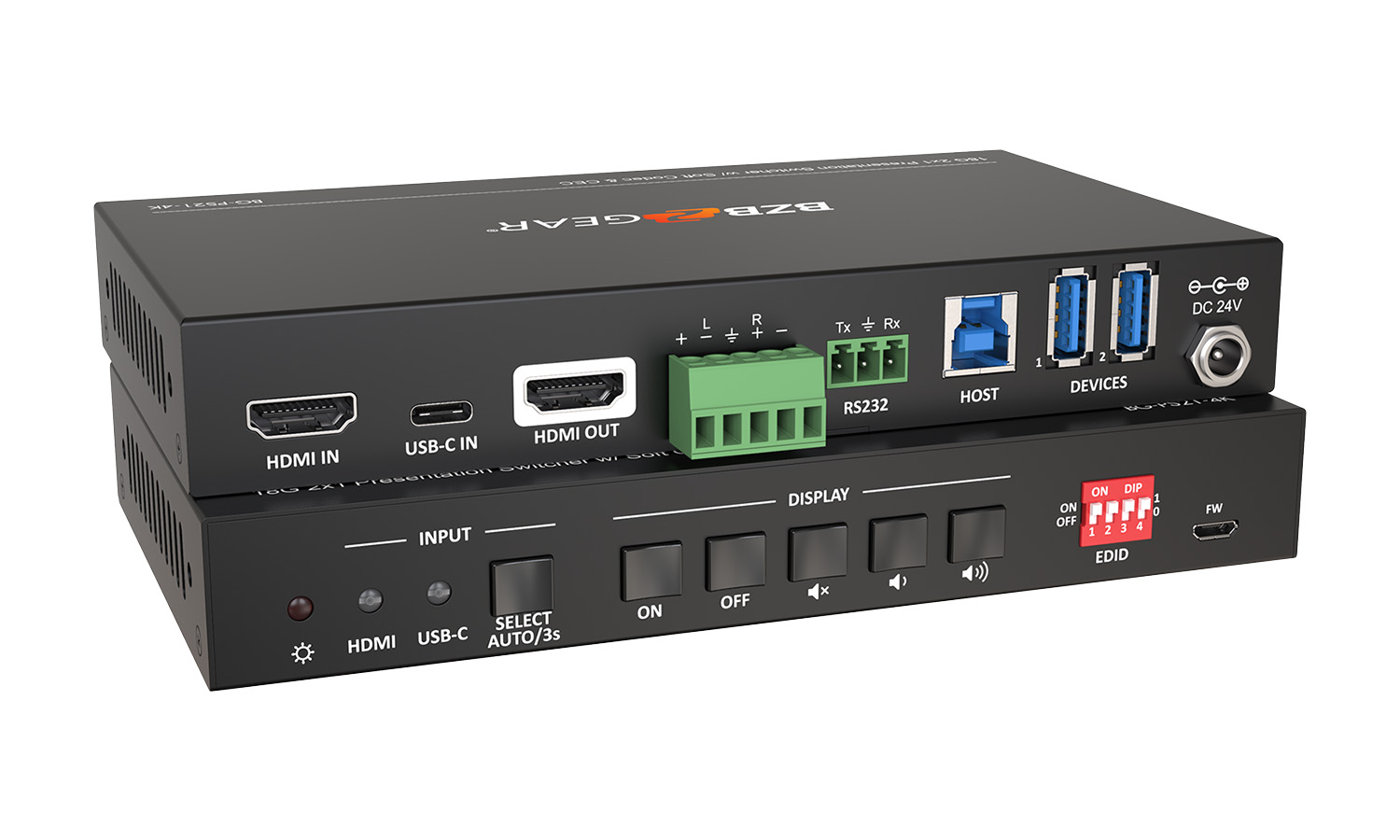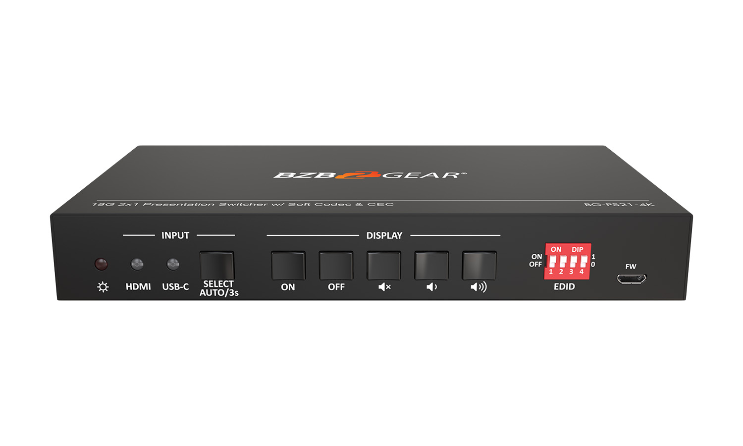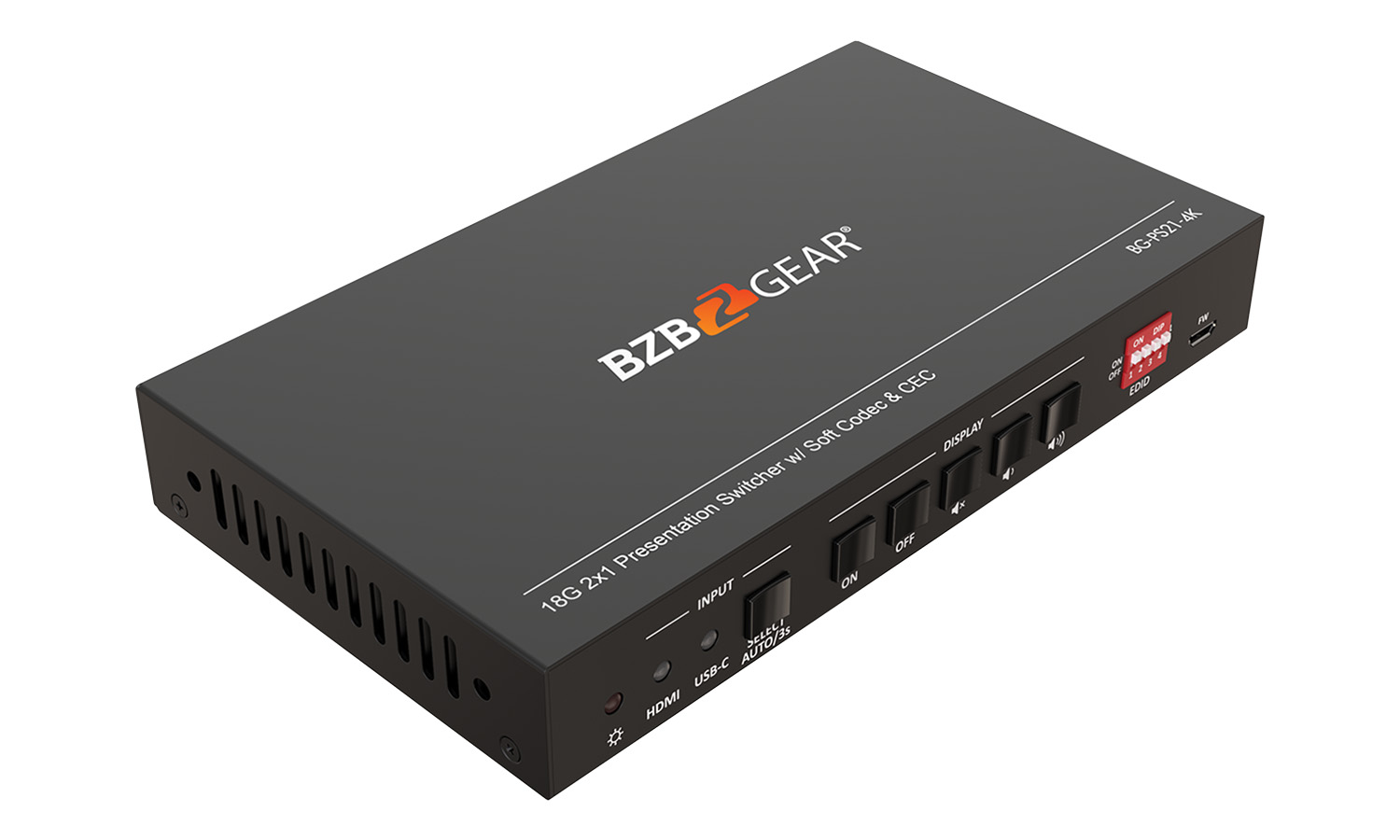 With two HDMI ports for input, the BG-PS21-4K can easily connect two separate devices. There is one HDMI output to send the signal to a single display, enabling presenters to share content during meetings. This device supports HDMI 2.0 and HDCP 2.2. The resolution for HDMI inputs supports up to 4Kx2K @ 60Hz. There is also a USB-C port which offers 4Kx2K @ 30Hz resolution. Additionally, the USB-C port provides 40 watts of charging to keep devices online through the entirety of a presentation. Auto-switching between active inputs is also supported.