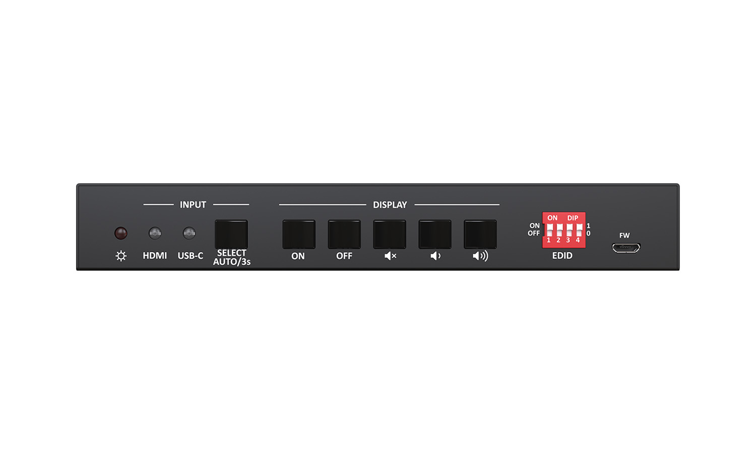 Using the two USB 3.0/2.0 type-A ports, peripherals like mice and keyboards can be connected to control active content. The unit itself can be controlled via front panel buttons of the RS-232 interface. A 4-pin DIP switch is also provided for EDID settings. A balanced audio output is also included for audio de-embedding.