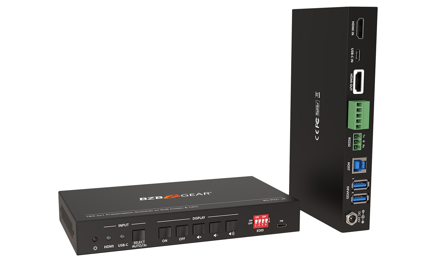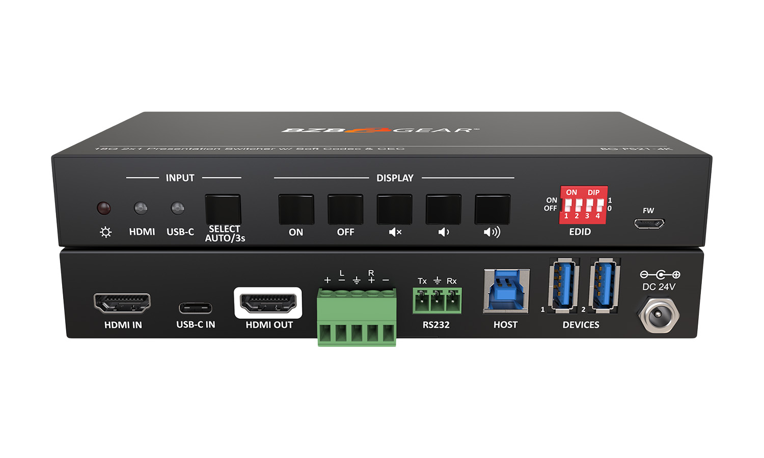 Built for flexible digital presentations, the BG-PS21-4K is a KVM switcher that enables two devices to be connected to the same display at output resolutions of up to 4K @ 60Hz. Thanks to its USB-A ports, users can control two connected devices with one mouse and keyboard. These USB peripherals can be shared between the HDMI/Host connections and the USB-C connection. The device will also automatically switch inputs when a signal is detected via HDMI.