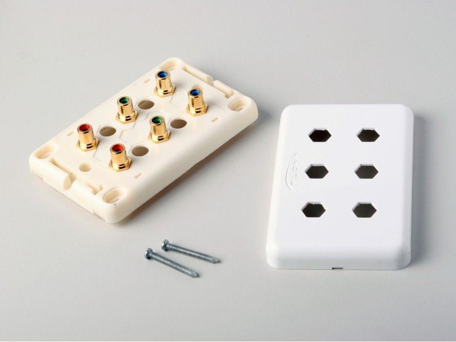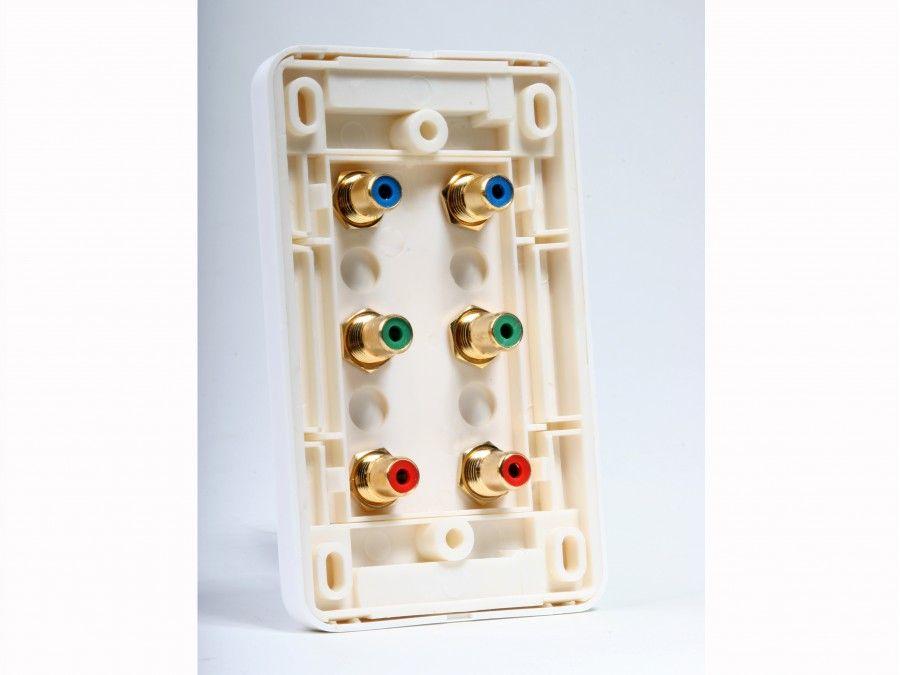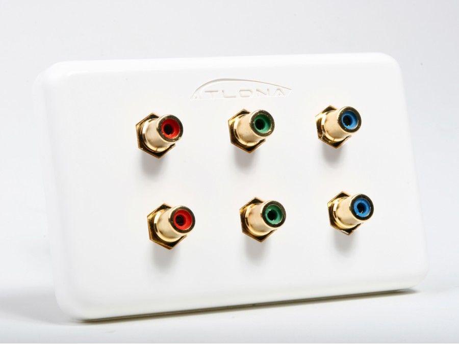 Atlona Dual Component Video Wall Plate with 6 RCA jacks. This wall plate is designed for any installation that requires running cables in the walls. The cable can be attached to the wall plate only if it has RCA connectors. The wall plate is color coded for component video connection, but it can also be used to connect any other cable that has RCA connectors.