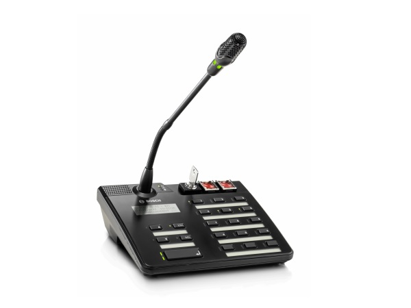 The PVA-15ECS is a call station for the PAVIRO system. As standard, the call station has a gooseneck microphone with pop shield and permanent monitoring, a total of 20 buttons, an illuminated LC display, and an integrated loudspeaker. Two alarm buttons with protective covers and a key switch are factory fitted as standard. The call station can be modified to suit the user’s requirements by connecting up to five PVA-20CSE call station extensions, each with 20 customizable selection buttons.