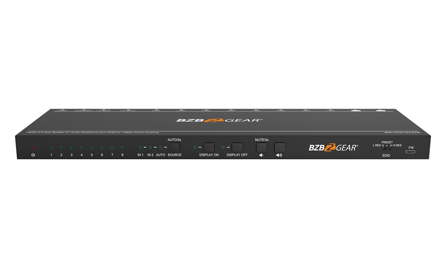 The BG-UHD-DA2X8 is an 8-way 4K HDMI splitter with two inputs. With a maximum resolution of 4K @ 60Hz, this unit makes it easy for users to share two 4K sources with up to 8 displays. This device is a simple, cost-effective solution for restaurants, bars, and retail spaces.