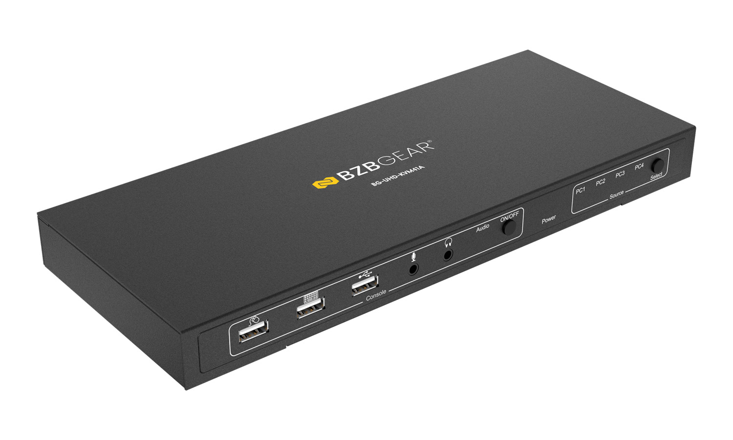 The BG-UHD-KVM41A is simple to operate using the front panel buttons. The source select button toggles between the four connected computers, switching the HDMI and peripheral connections. It can also be operated using hotkeys. There is also an audio toggle which enables/disables the audio in/out connections.