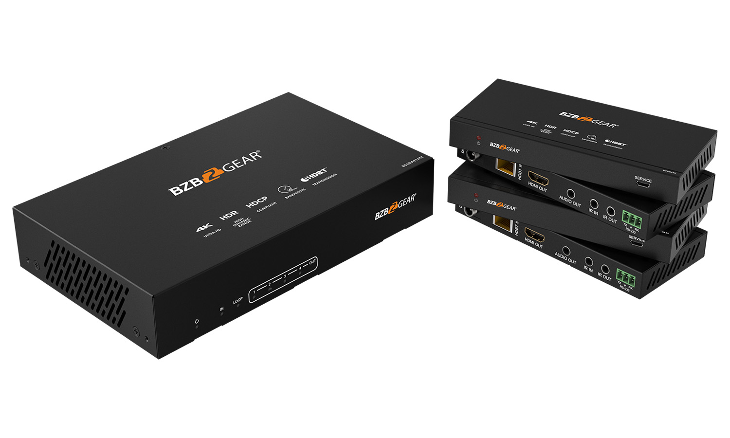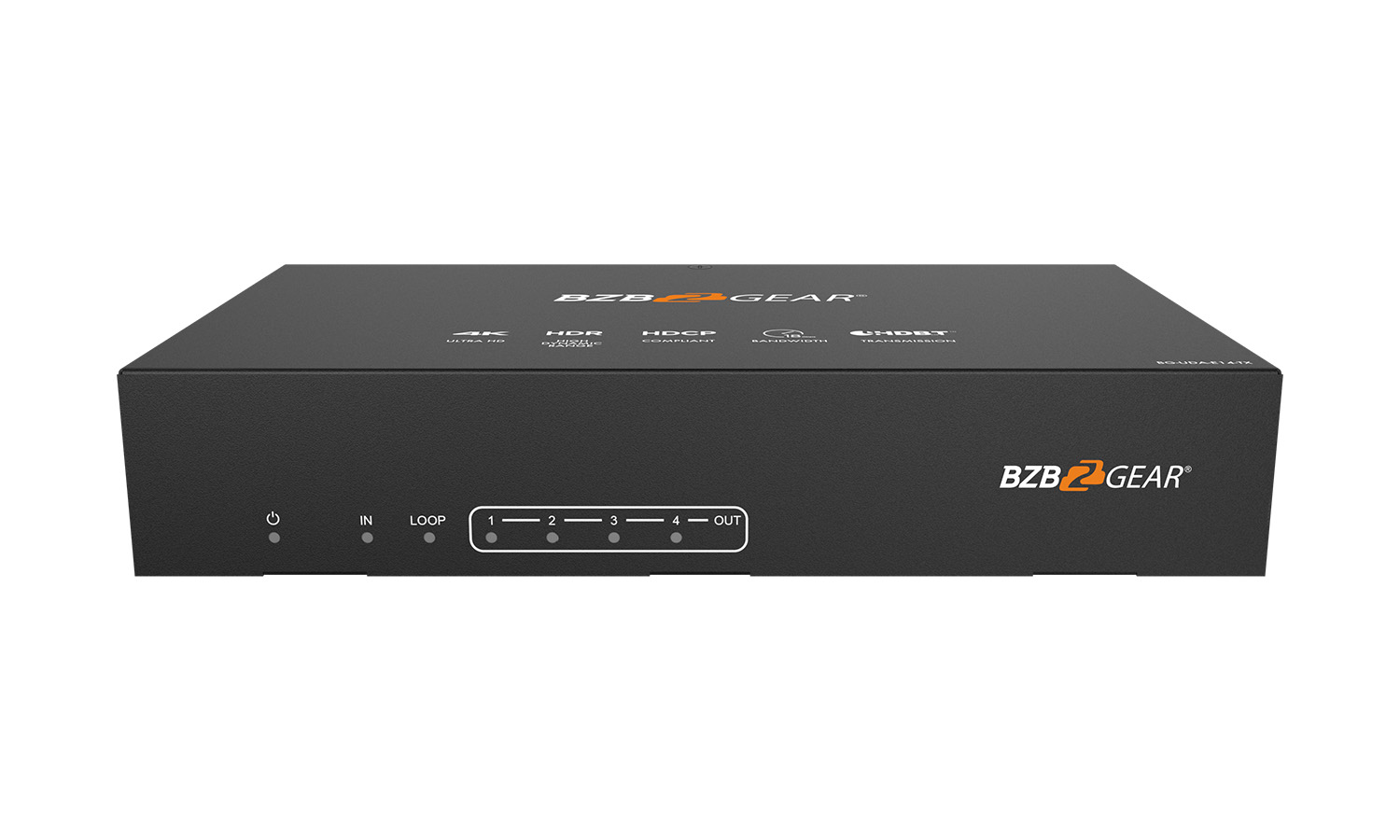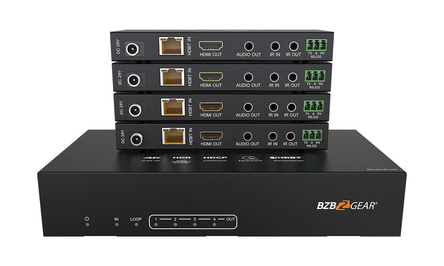 The BG-UDA-E14 is a 1×4 4K HDBaseT splitter/extender kit. Supporting resolutions up to 4K @ 60Hz, users can extend HDMI sources over category 6 cabling at distances up to 390 feet, or up to 490 feet at 1080P @ 60Hz with the included HDBaseT extenders. With the ability to connect to one local and four remote displays, this unit is ideally suited for use in restaurants, sports bars, retail spaces, and auditoriums.