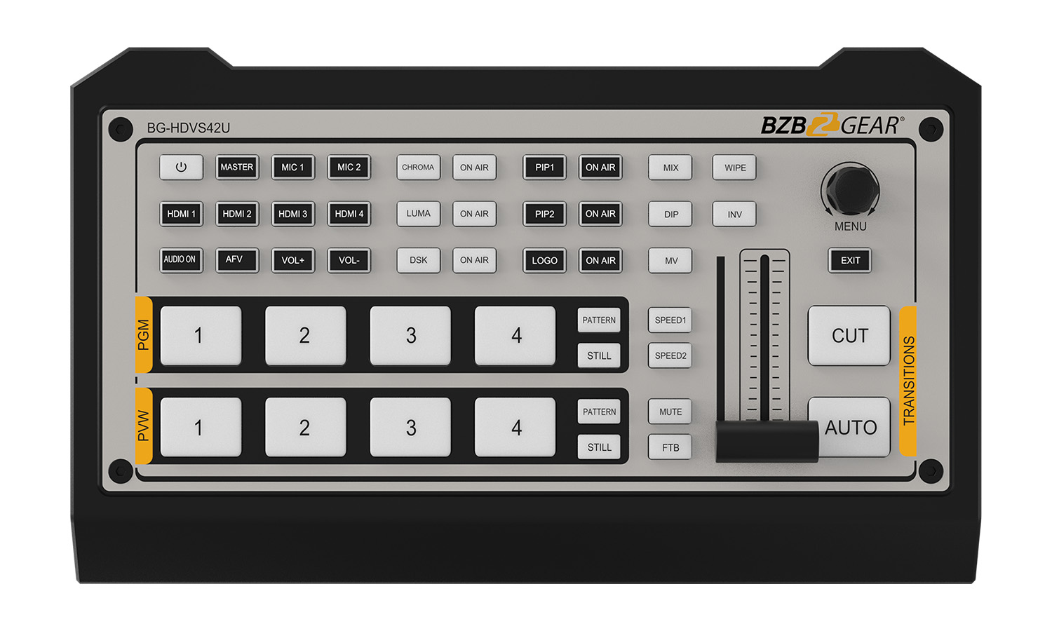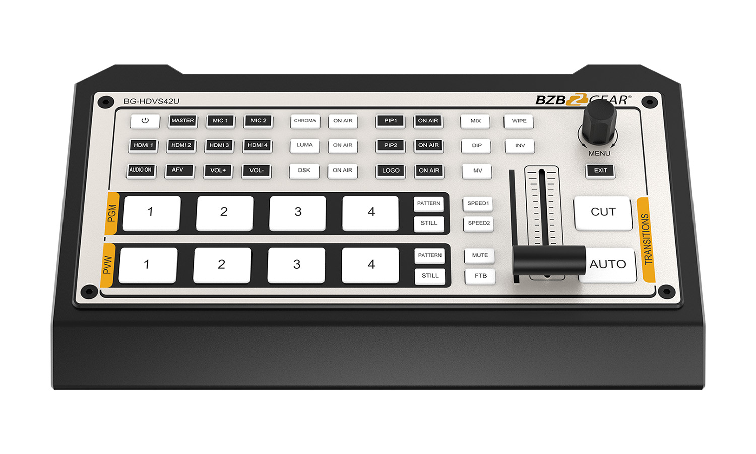 Compact and versatile, the BG-HDVS42U HDMI production switcher provides users with a powerful set of features designed to deliver professional-quality results. With full audio mixing capabilities, multiple transition options, graphic overlays, PC software utility, and USB-C program output, the BG-HDVS42U provides high-performance and tremendous value.
