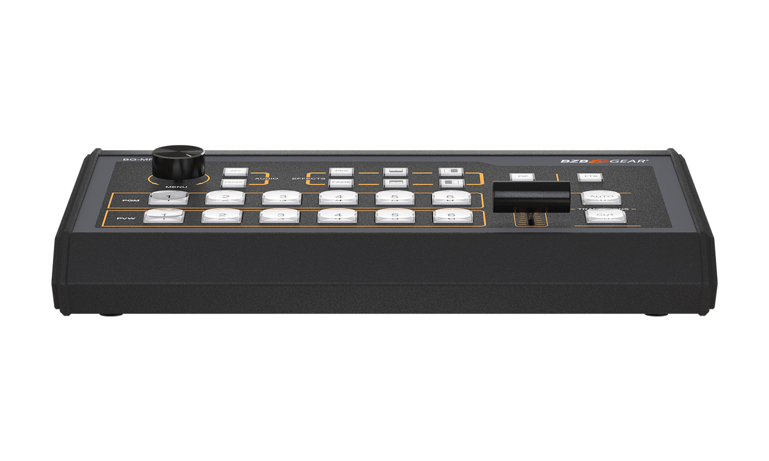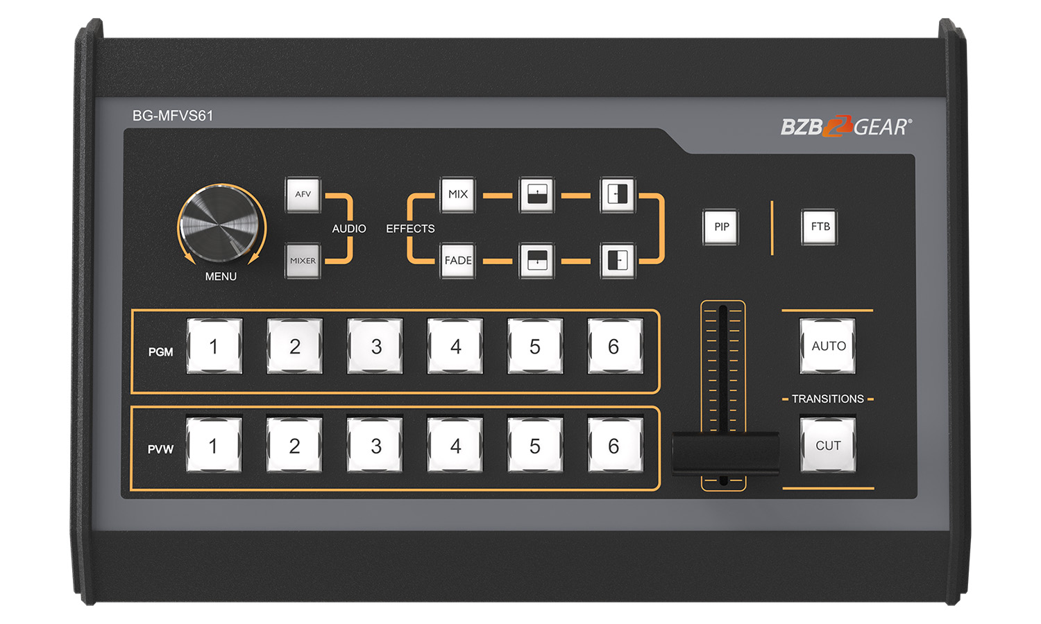 The T-bar slider, auto, and cut buttons provide control for transitions using the BG-MFVS61-G2’s various wipe, mix, and fade effects. Picture in Picture (PIP) mode allows userse to easily resize and reposition the PIP window. The easy to use control layout allows even novice users to acheive professional quality results.