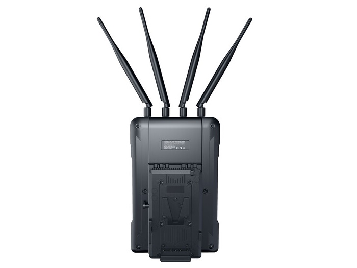 The receiver features four SDI and four HDMI outputs (one for each transmitter) for connecting to a monitor or switcher. You can control PTZ cameras via IP or RS-422/485 serial connections. The transmitters have a dedicated tally output port that support optional tally lights. Both units also have an OLED display that confirms the resolution, transmission channel, signal strength, and other details such as battery power. Each transmitter has an L-series battery plate, and the receiver has a V-mount battery plate. Both Transmitters and receiver also feature a 2-pin power input for alternate DC power options.